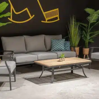 הסט בנוי מאלומיניום “אל חלד” בשילוב משטח עץ עליון לשולחן.