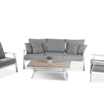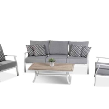 המערכת כוללת ספה תלת, זוג ספות יחיד ושולחן מעוצב.