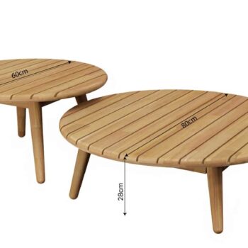 שולחנות: קוטר 80 ס”מ גובה 28 ס”מ + שולחן קוטר 60 ס”מ גובה 36 ס”מ.