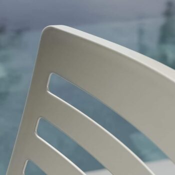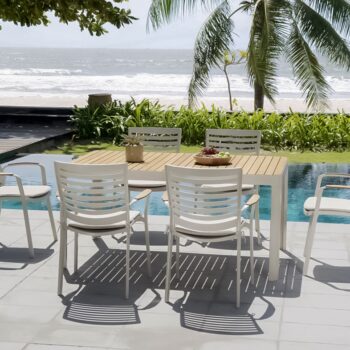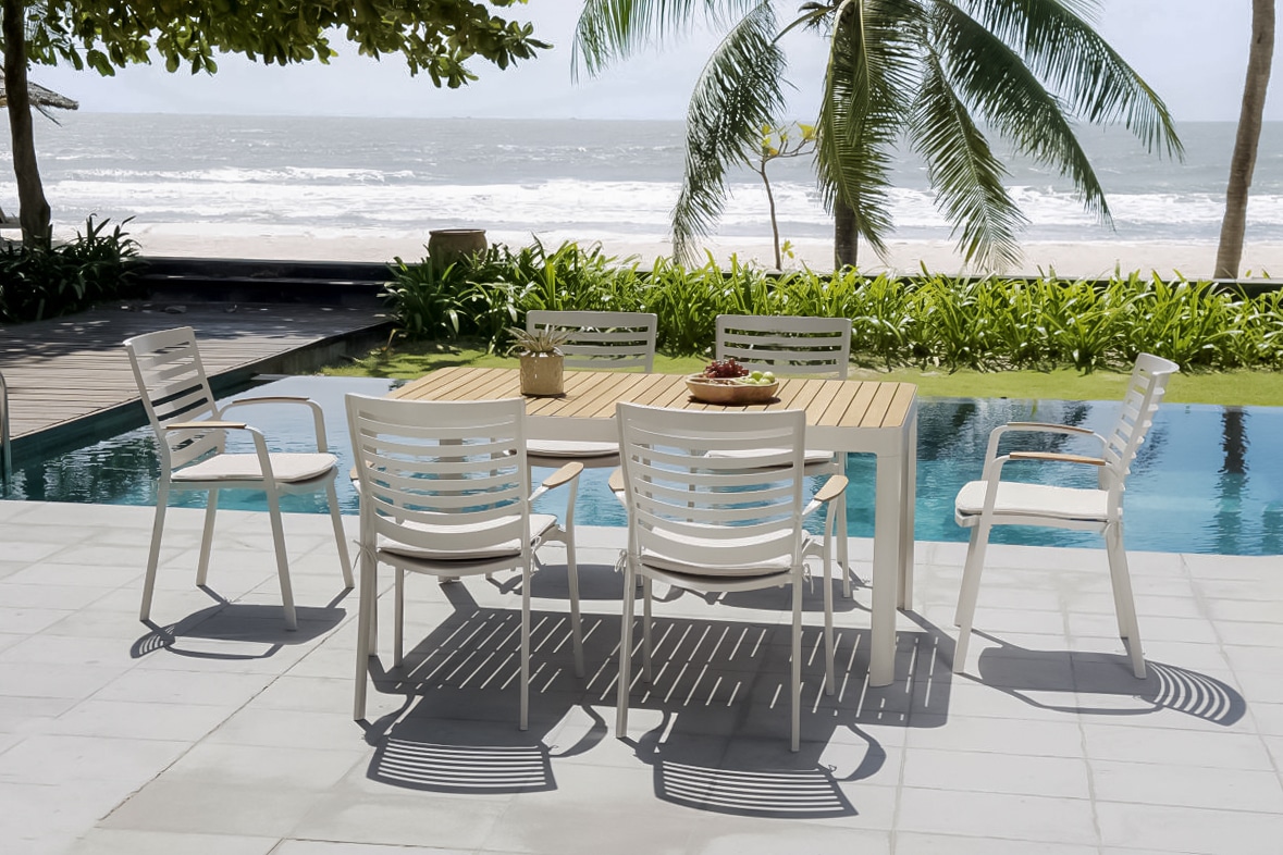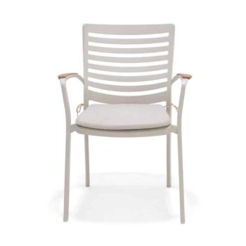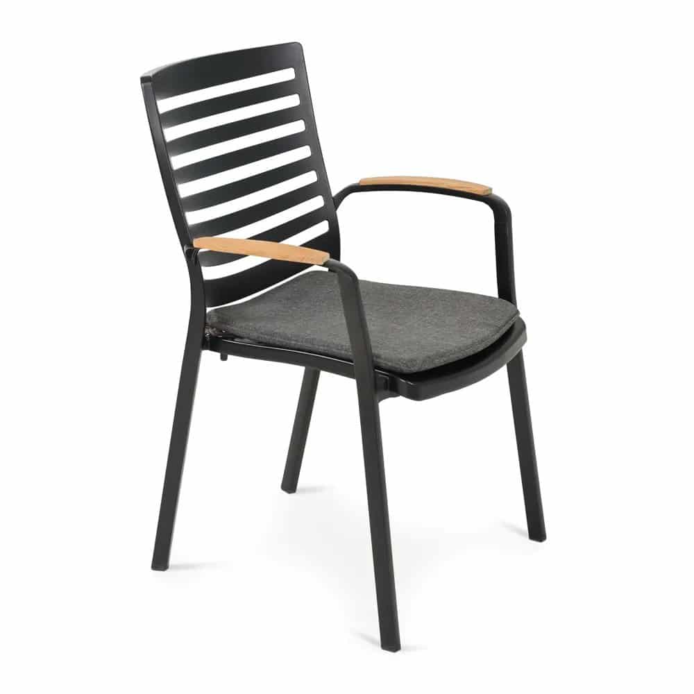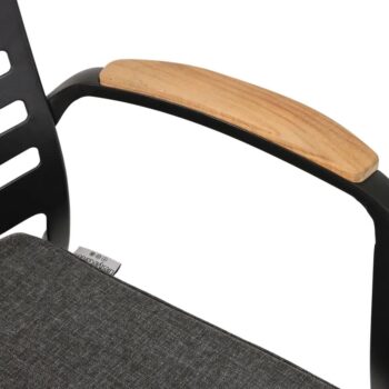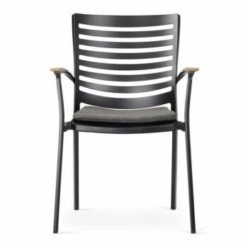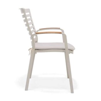 כיסא מעוצב ויוקרתי אשר בנוי משלדת אלומיניום “אל חלד” בשילוב משענות ידיים מעץ טיק אינדונזי.