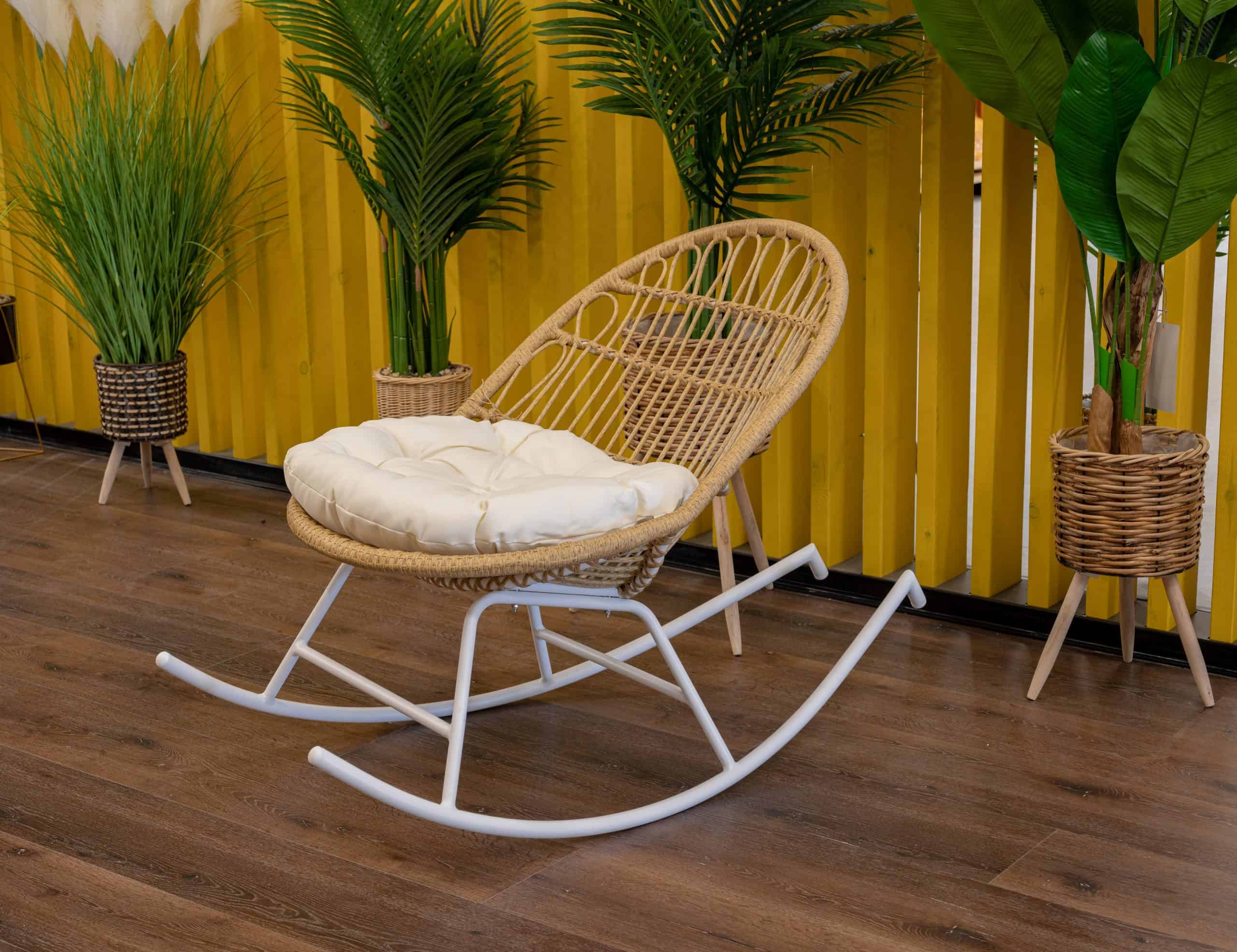 שלדה לבנה, ראטן דמוי טבעי וריפוד לבן קרם.