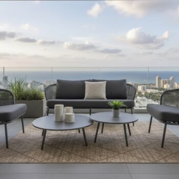 מערכת ישיבה מפוארת הבנויה משלדת אלומיניום “אל חלד” בשילוב חבלי נאוטיקה עמידים לחוץ.