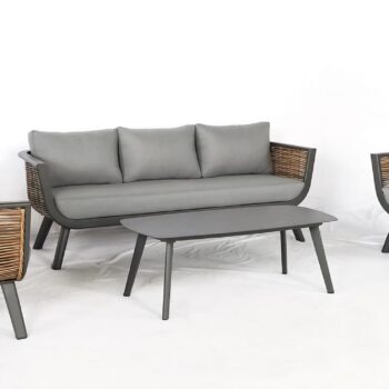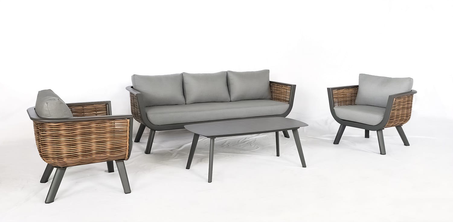 אלומיניום אפור כהה, ראטן דמוי טבעי, ריפוד אפור.