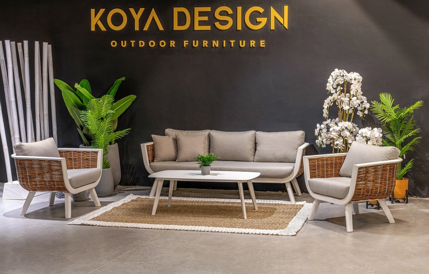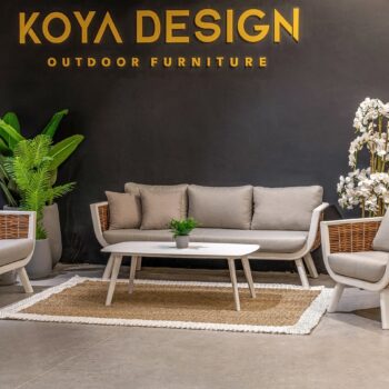 אלומיניום לבן, ראטן דמוי טבעי, ריפוד אפור קרם.