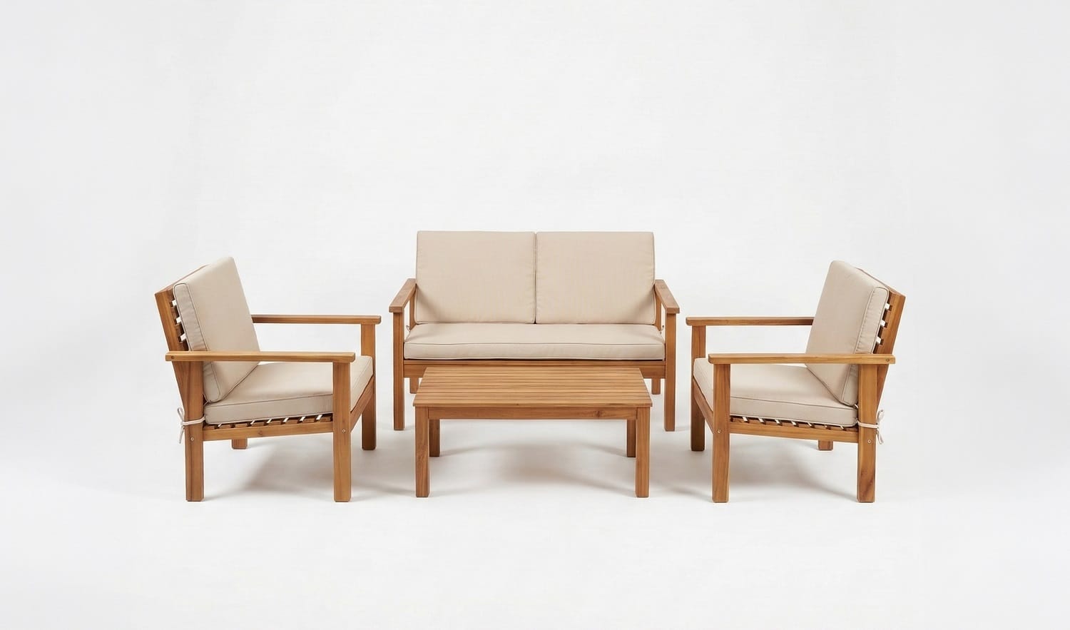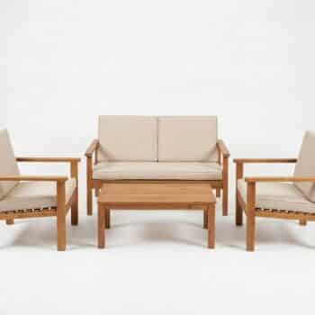 הסט ישיבה מעץ מורכב מספה זוגית + 2 ספות יחיד ושולחן.