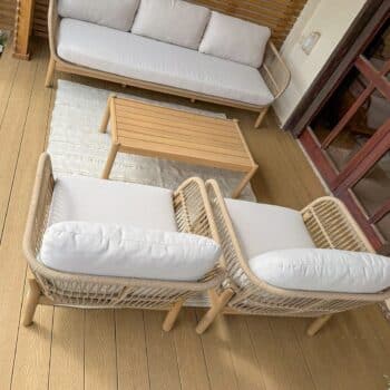סט 5 מושבים מעוצב המשלב מראה טבעי של עץ שיטה מלא עם שלדת אלומיניום “אל חלד” עם קליעת חבלים סינתטיים למראה יוקרתי.