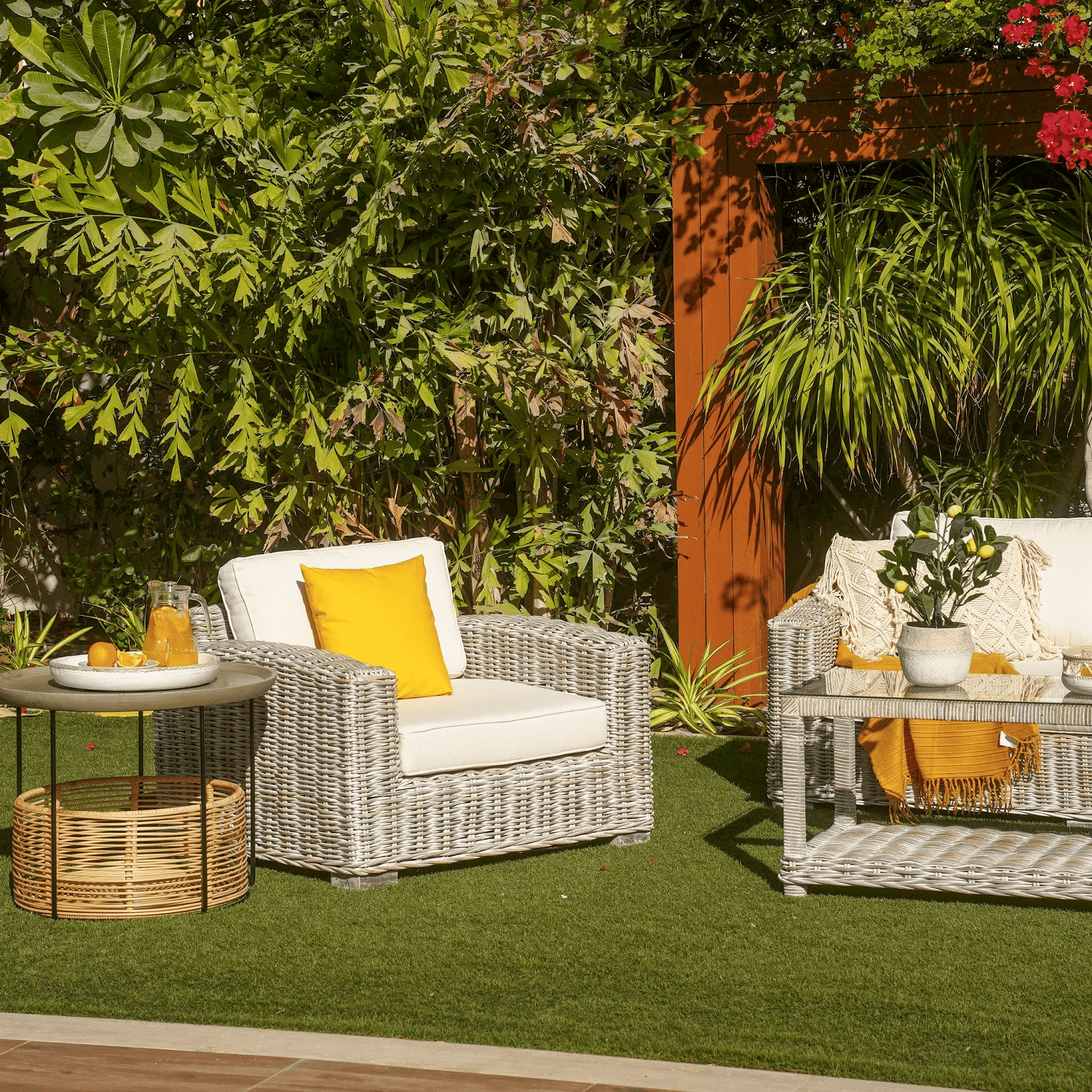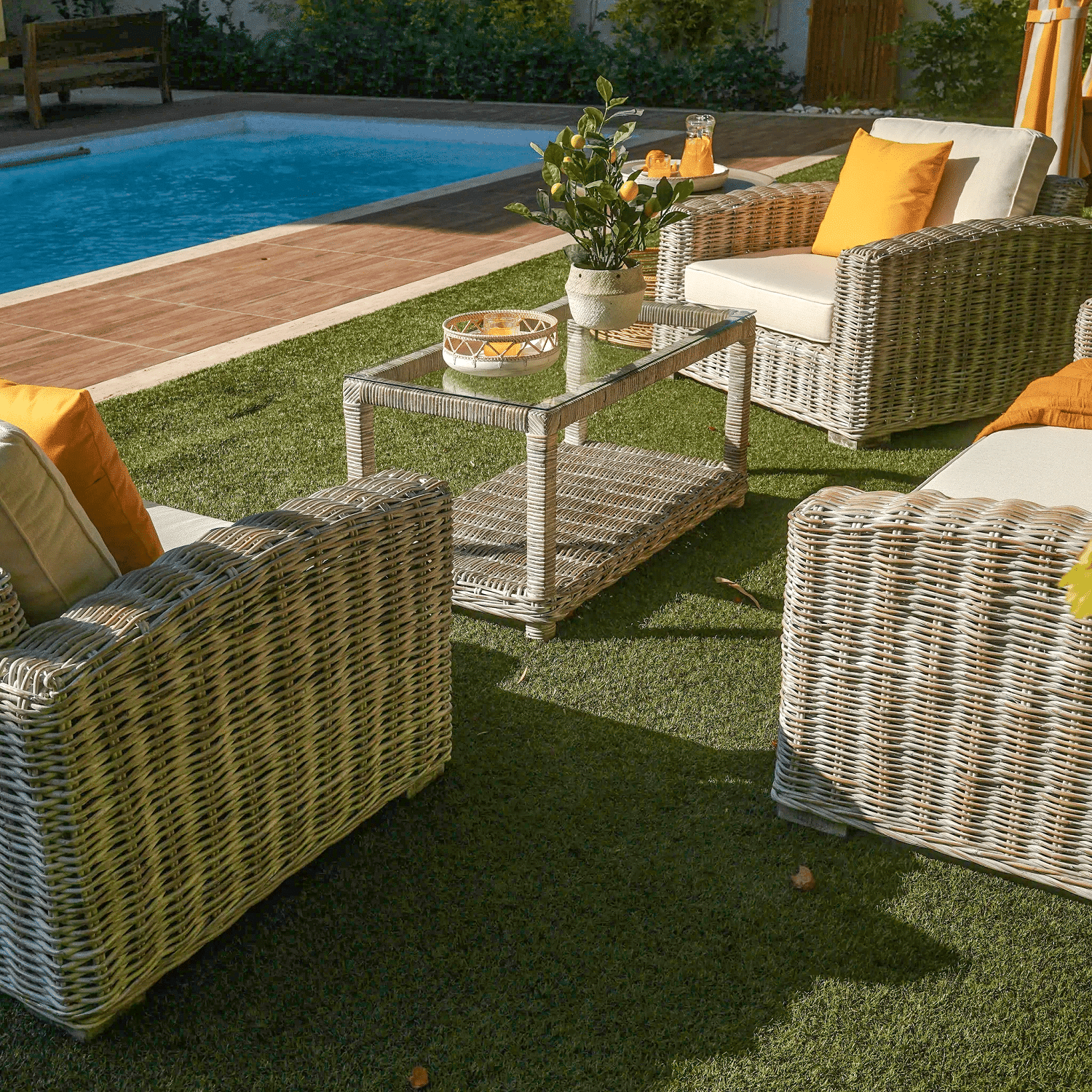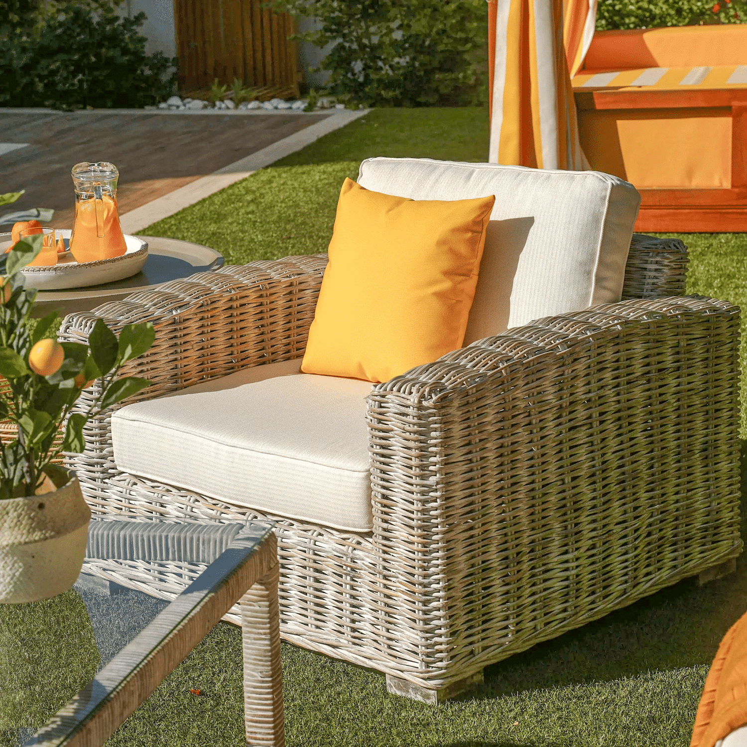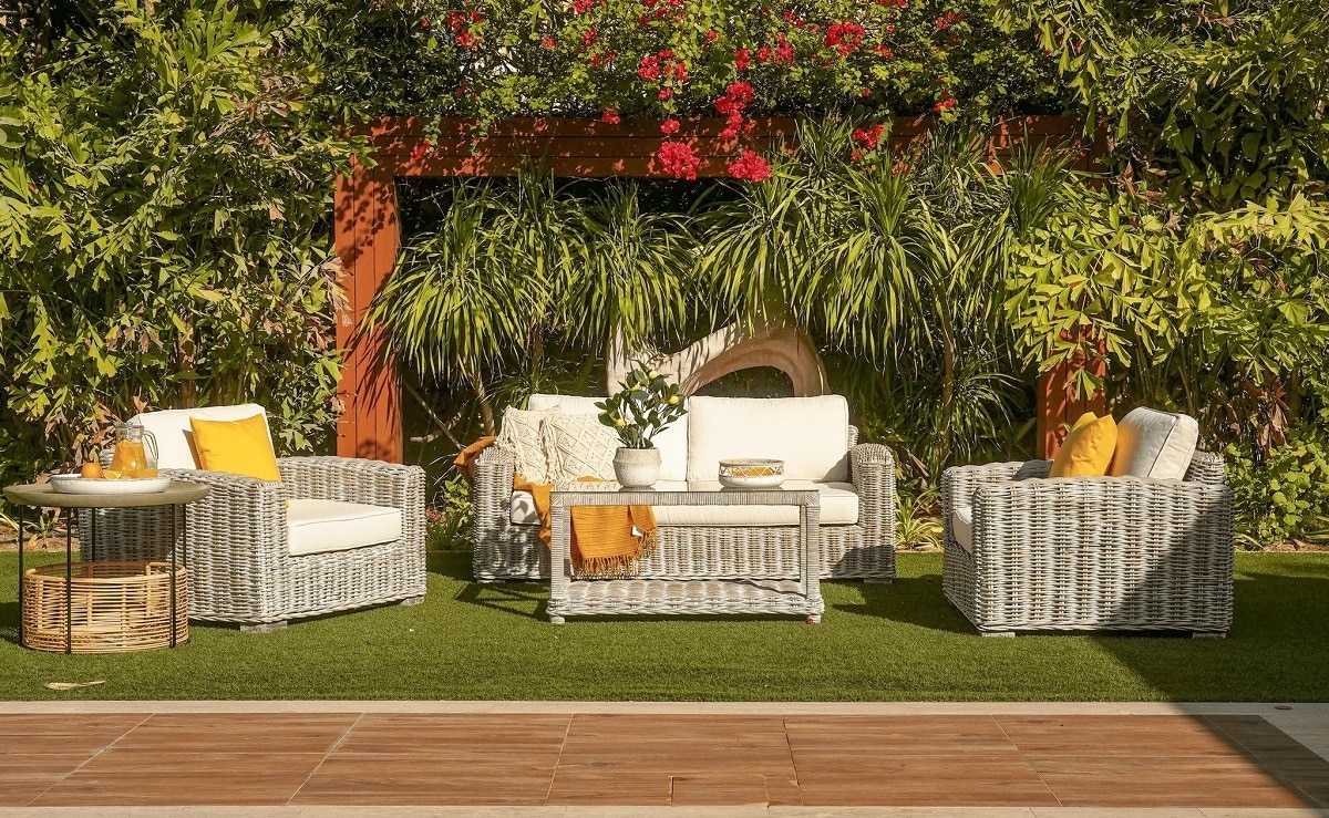 סט ורונה כולל ריהוט גן יוקרתי בעיצוב טבעי עם נוכחות חמה ומזמינה, המשלב שלדת עץ מהגוני