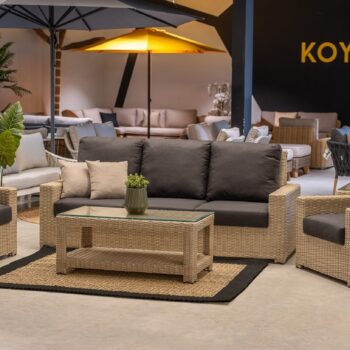 המערכת כוללת ספת תלת, 2 ספות יחיד, שולחן צד ושולחן קפה גדול.