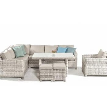 המערכת כולל ספת תלת, ספה תלת פינתית, ספת יחיד, 2 הדומים ושולחן גבוה.