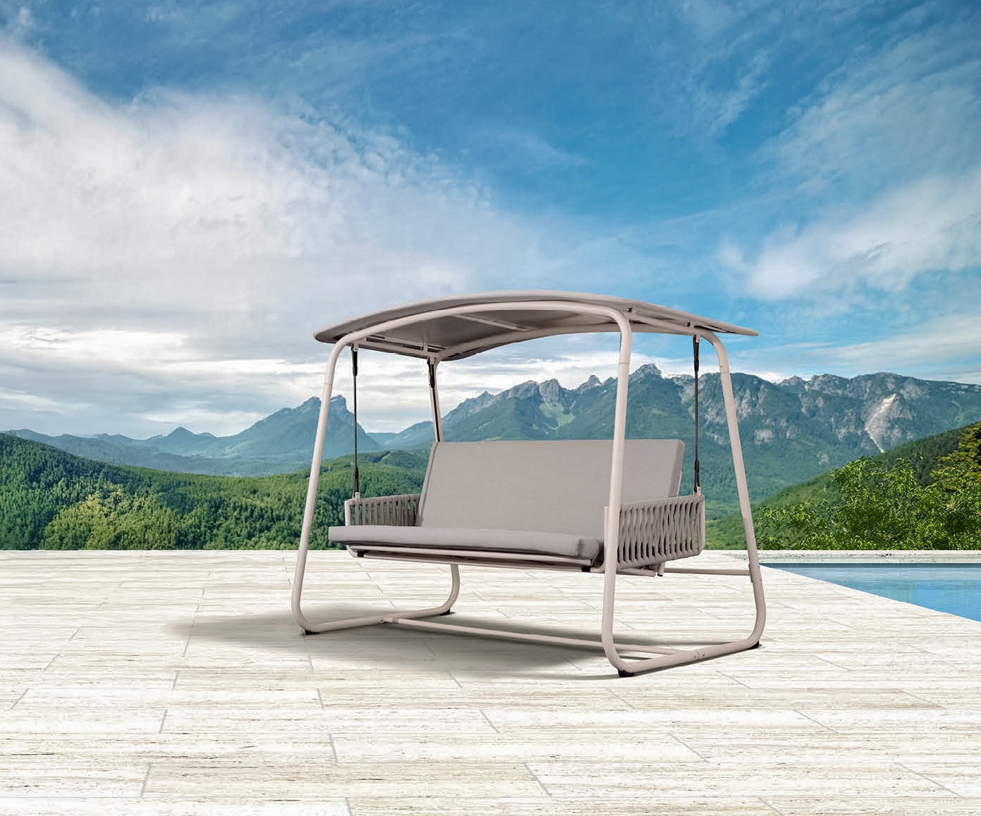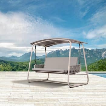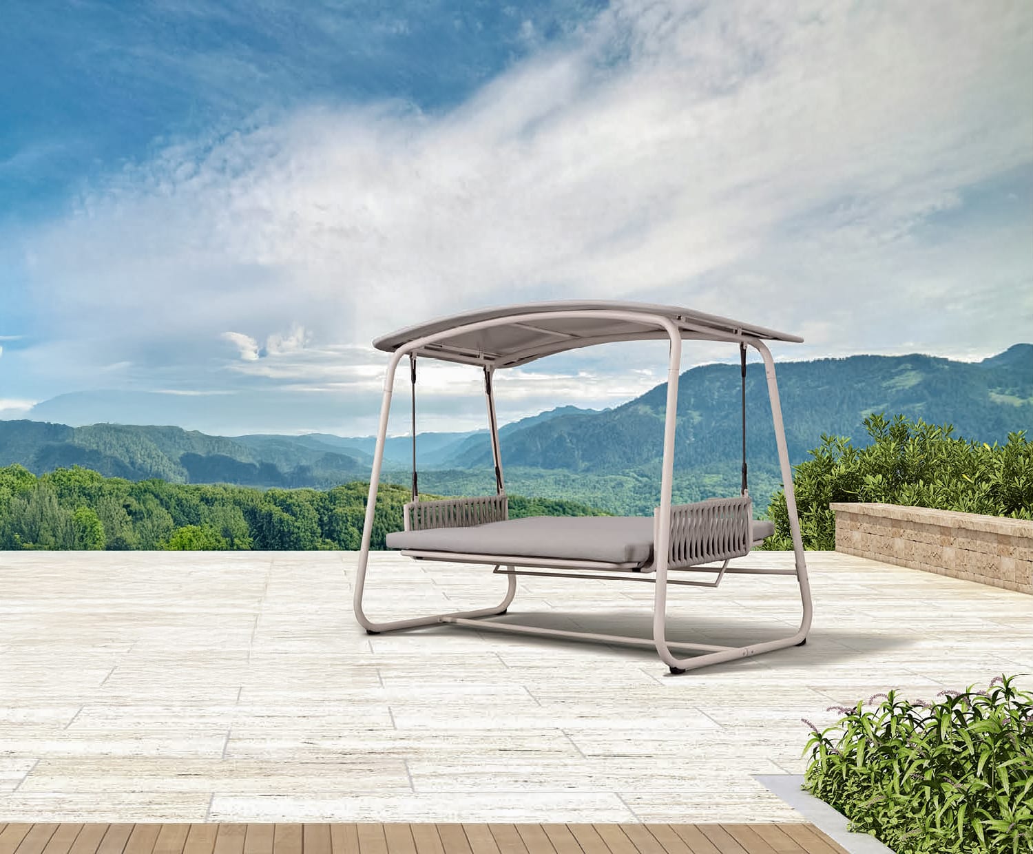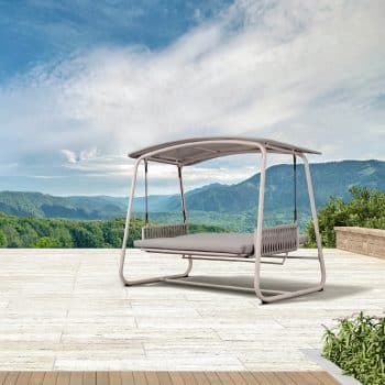 נדנדה זוגית מרשימה עם אפשרות פתיחה למיטה, פתרון מושלם לרגעי מנוחה, אירוח או פינת רביצה מפנקת בחוץ.