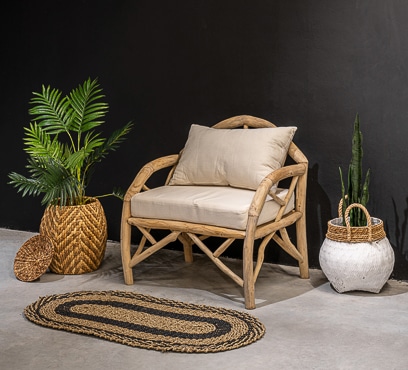 הספה בנוי מענפי טיק בעיצוב כפרי.