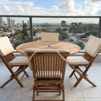 הפינה כוללת שולחן בקוטר 100 ס”מ בשילוב 4 כיסאות מדגם מודנה כולל ריפוד ישיבה וגב.