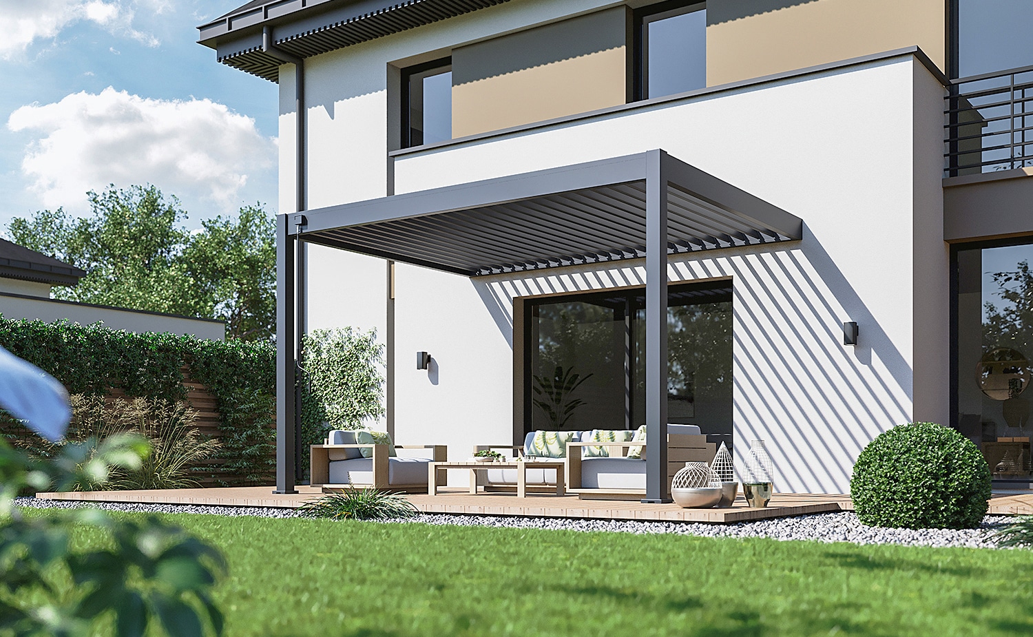 פרגולה חזקה ועמידה במיוחד הבנויה מאלומיניום בשילוב רפפה מאלומיניום “אל חלד”.