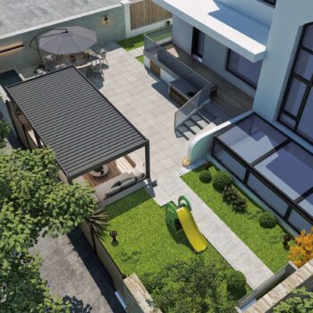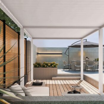 פרגולה חזקה ועמידה במיוחד הבנויה מאלומיניום בשילוב רפפה עשויה מאלומיניום “אל חלד”.