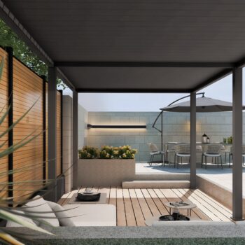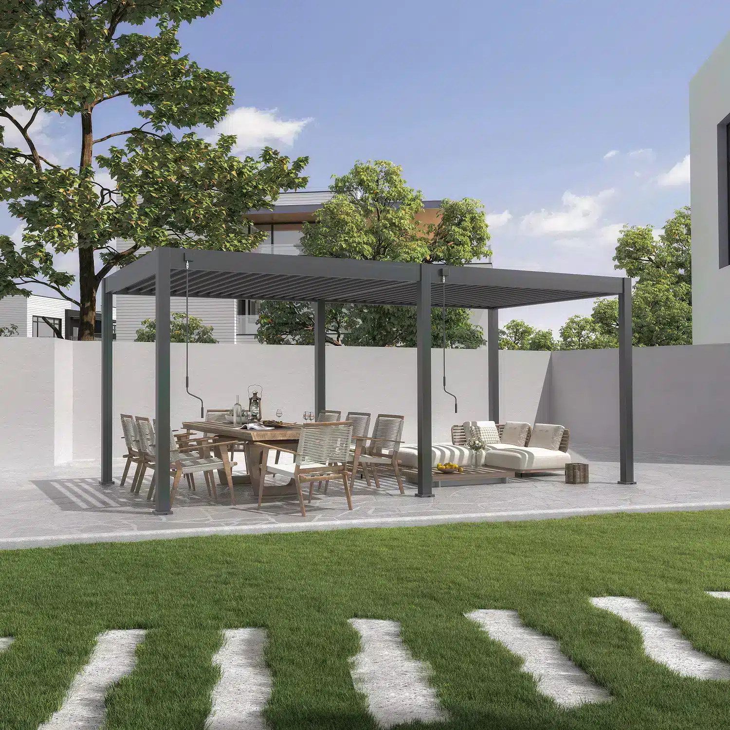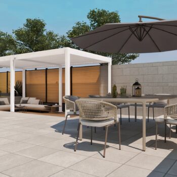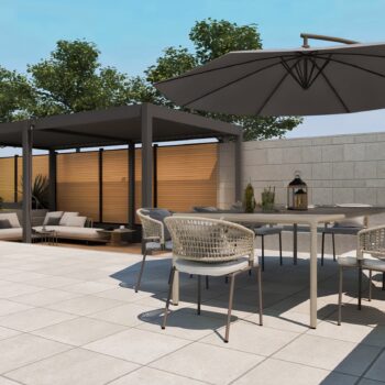 פרגולה חזקה ועמידה במיוחד הבנויה מאלומיניום בשילוב רפפה עשויה מאלומיניום “אל חלד”.