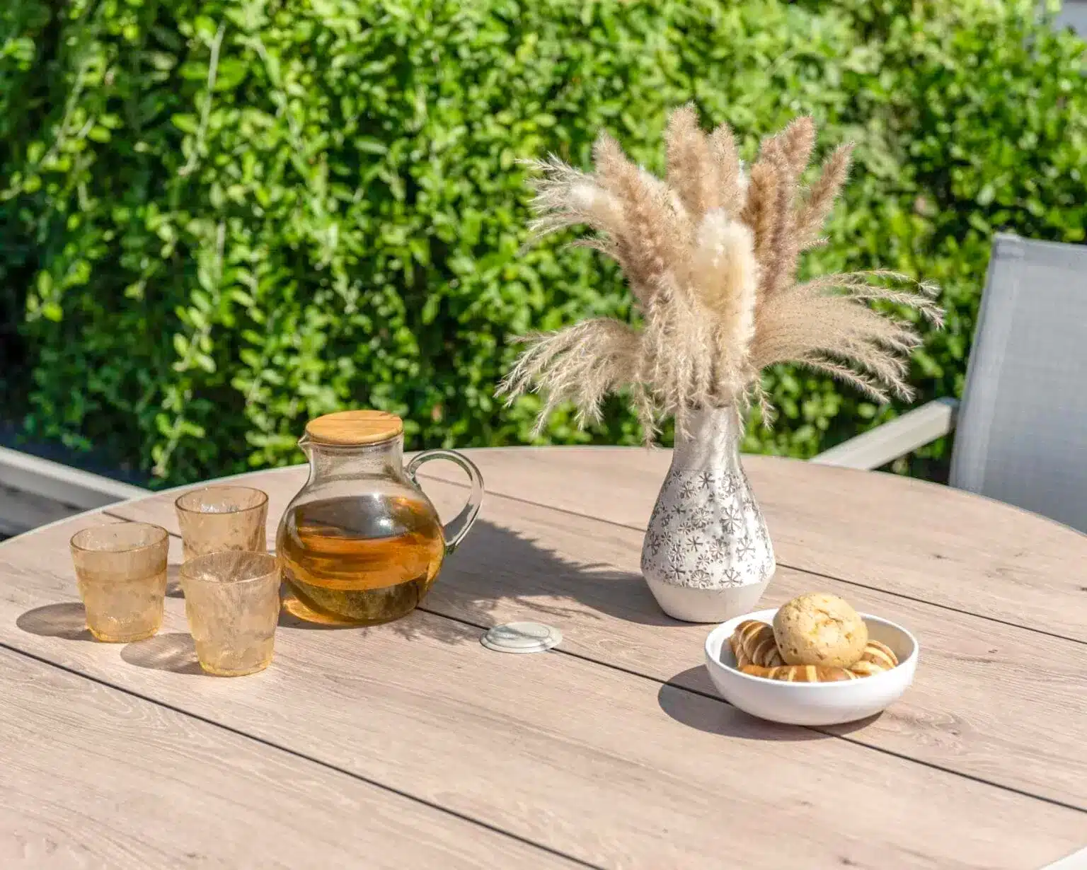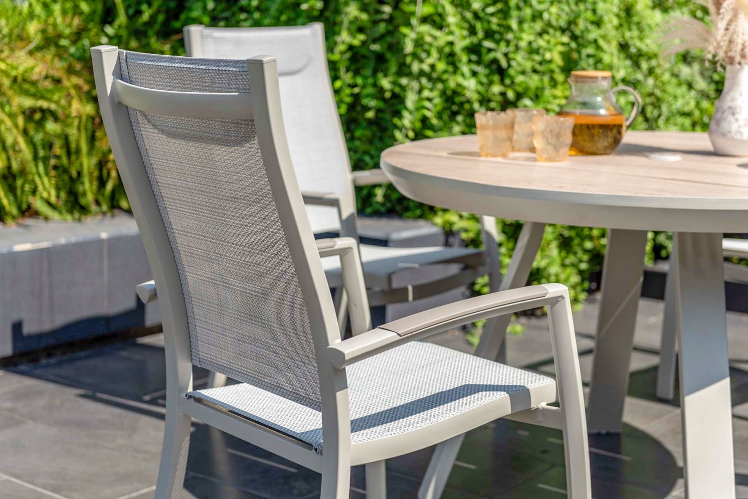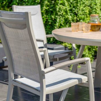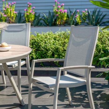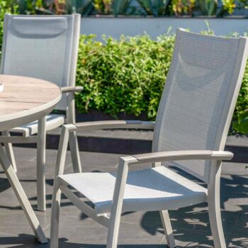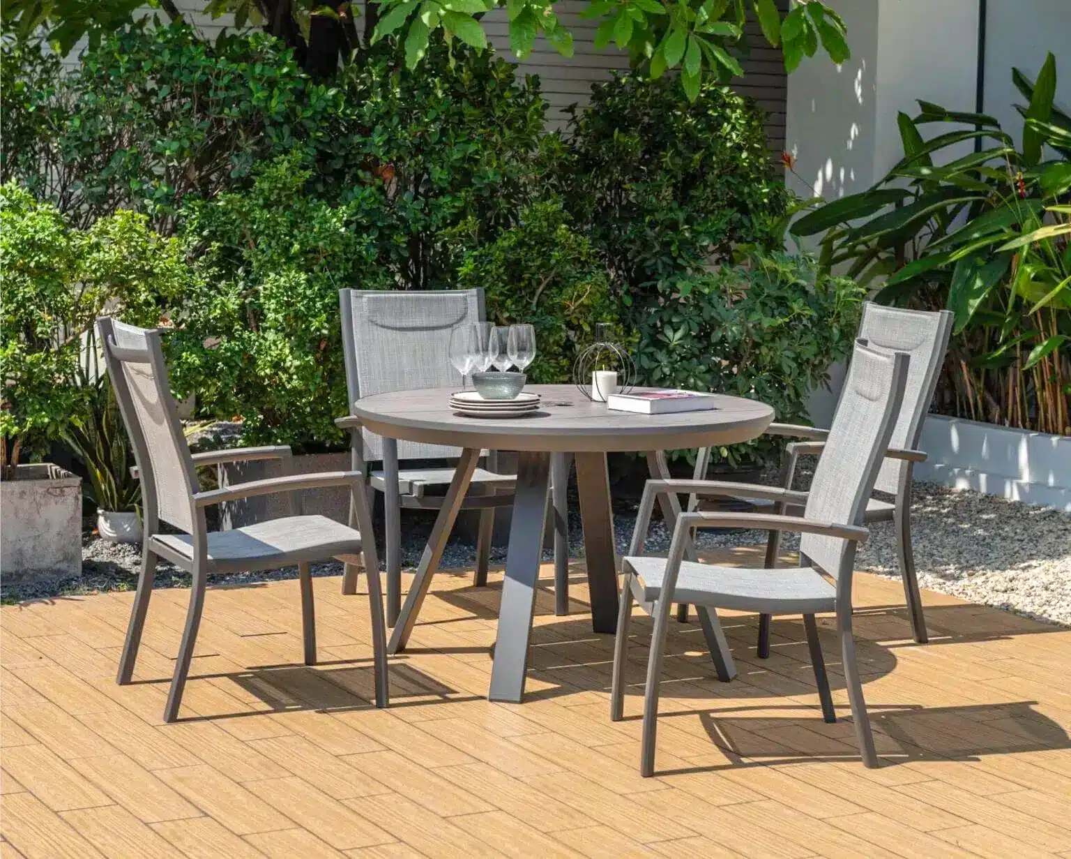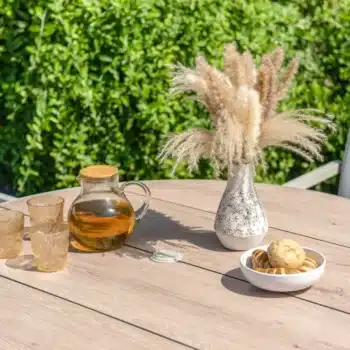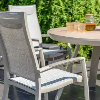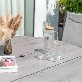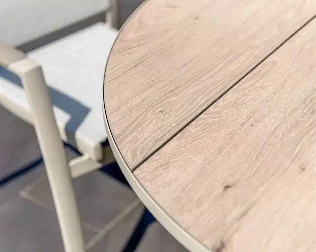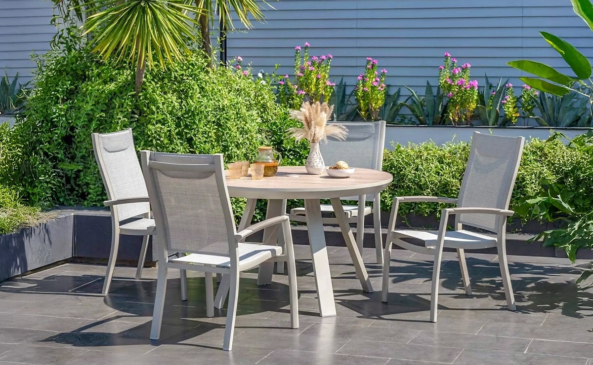 הפינה כוללת שולחן עגול בקוטר 119 ס”מ עם משטח DuraBoard: חומר מרוכב מתקדם המדמה עץ טבעי, עמיד במיוחד בפני מזג אוויר, שריטות ולכלוך, ואינו דורש תחזוקה.