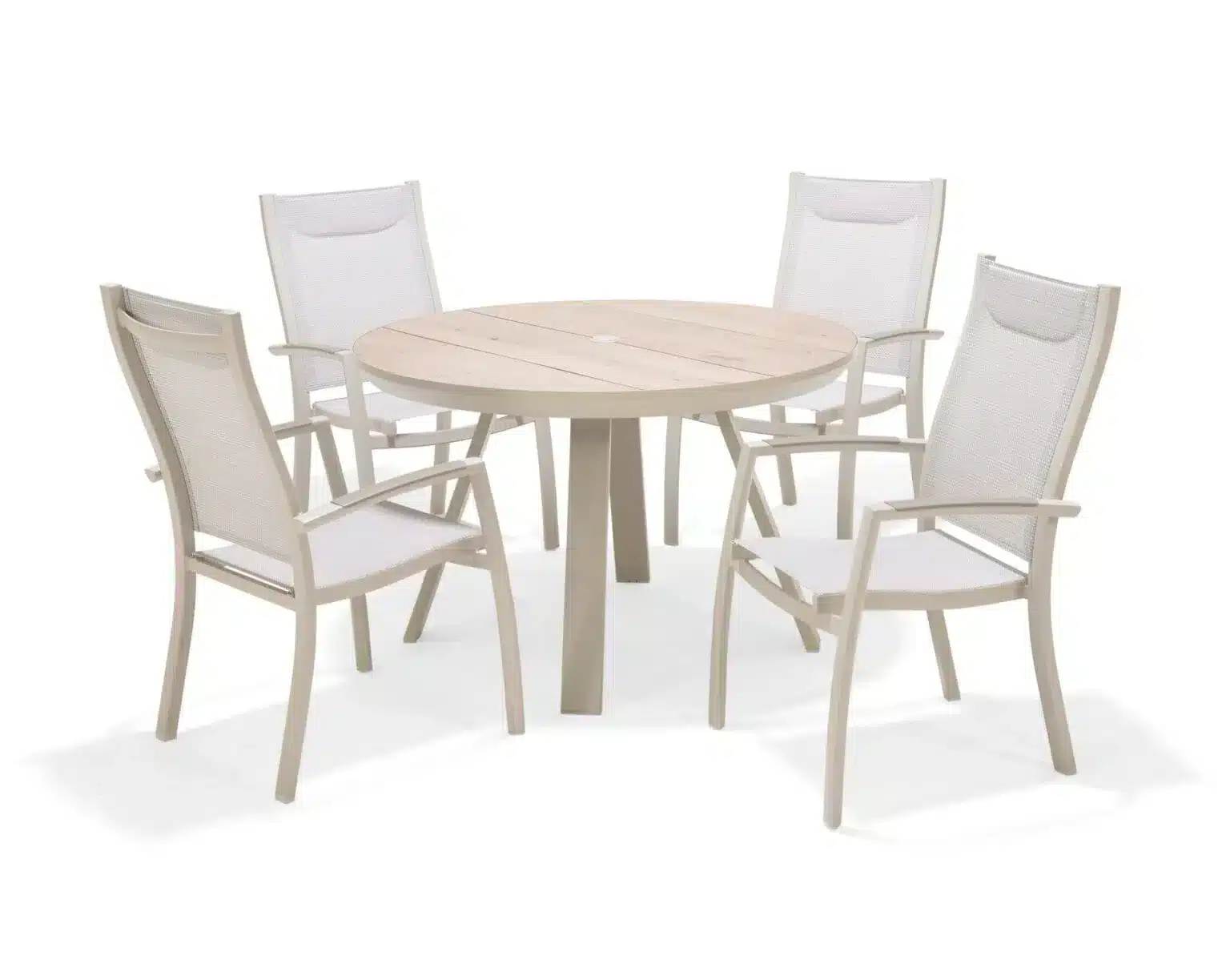 השולחן כולל שלדת אלומיניום אל-חלד חזקה, רגליים בעיצוב נקי ופתח מובנה לשמשייה – פתרון נוח לימים חמים.
