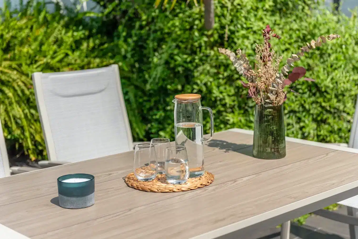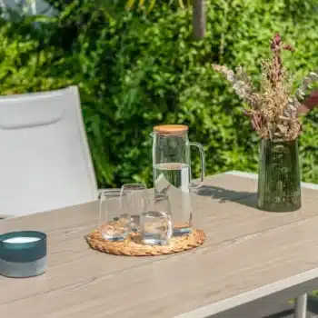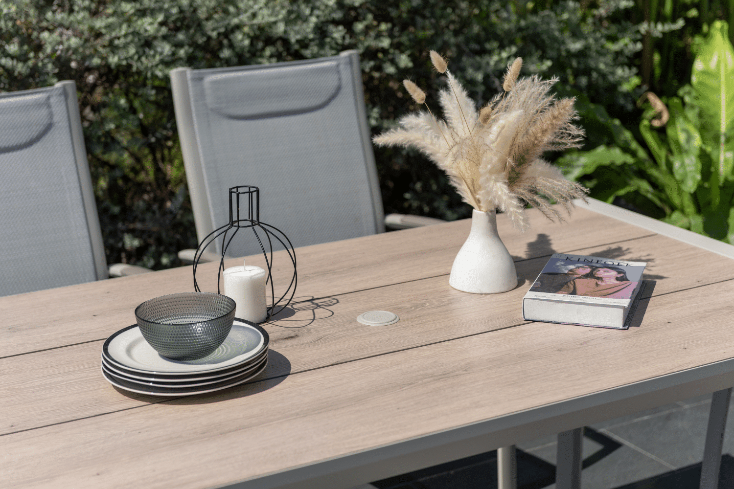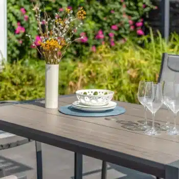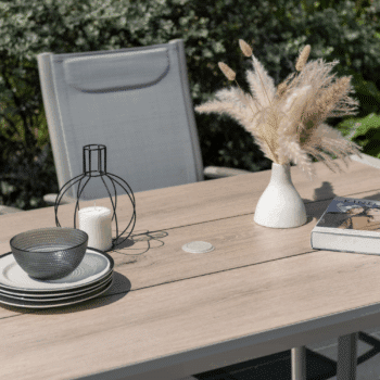הפינה כוללת שולחן מלבי באורך 160 ס”מ עם משטח DuraBoard: חומר מרוכב מתקדם המדמה עץ טבעי, עמיד במיוחד בפני מזג אוויר, שריטות ולכלוך, ואינו דורש תחזוקה.