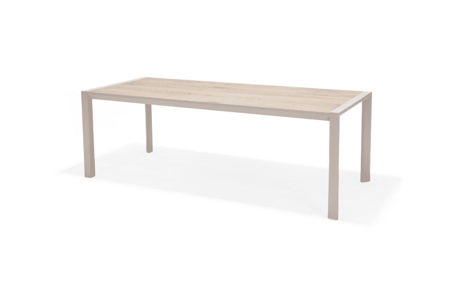 הפינה כוללת שולחן מלבי באורך 207 ס”מ עם משטח DuraBoard: חומר מרוכב מתקדם המדמה עץ טבעי, עמיד במיוחד בפני מזג אוויר, שריטות ולכלוך, ואינו דורש תחזוקה.