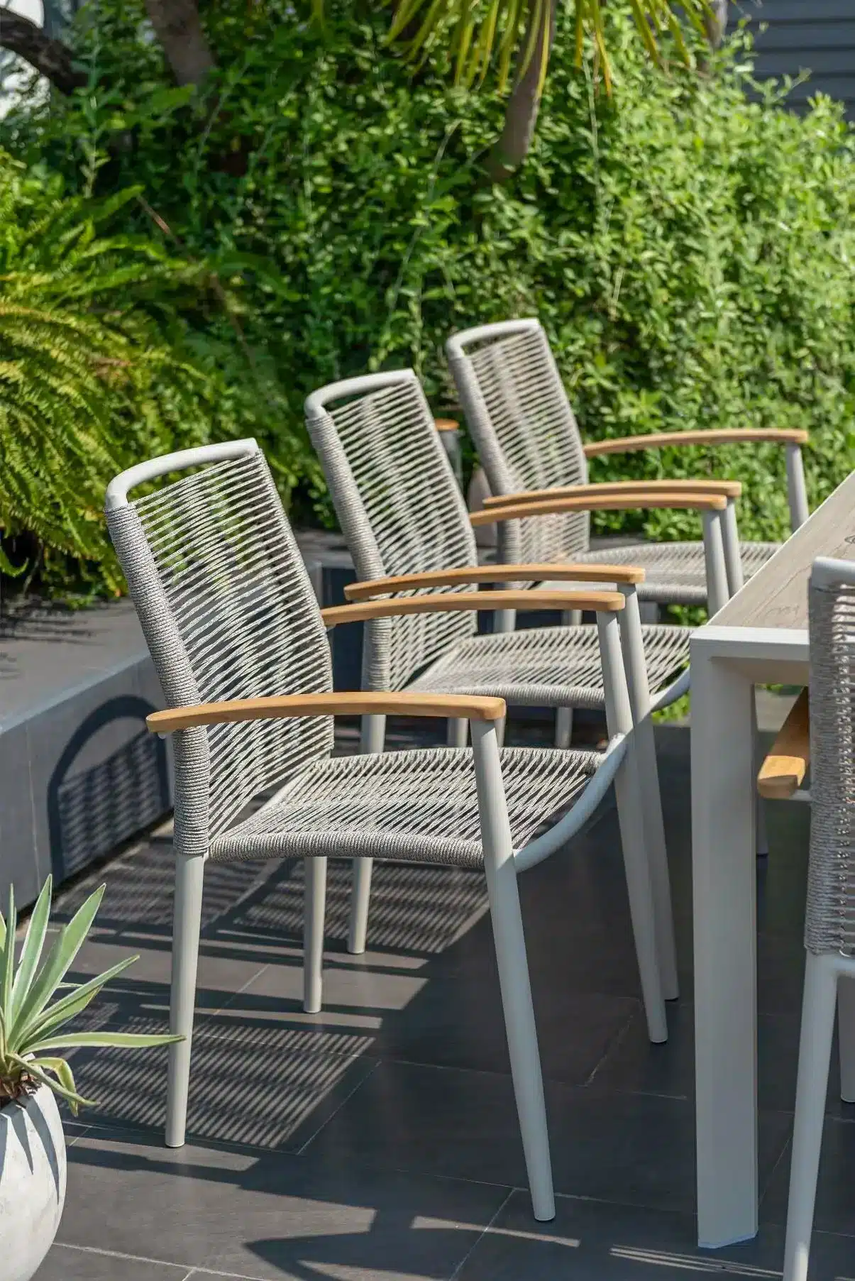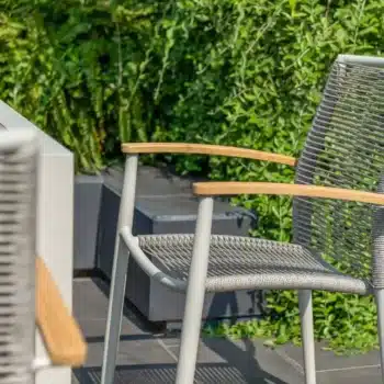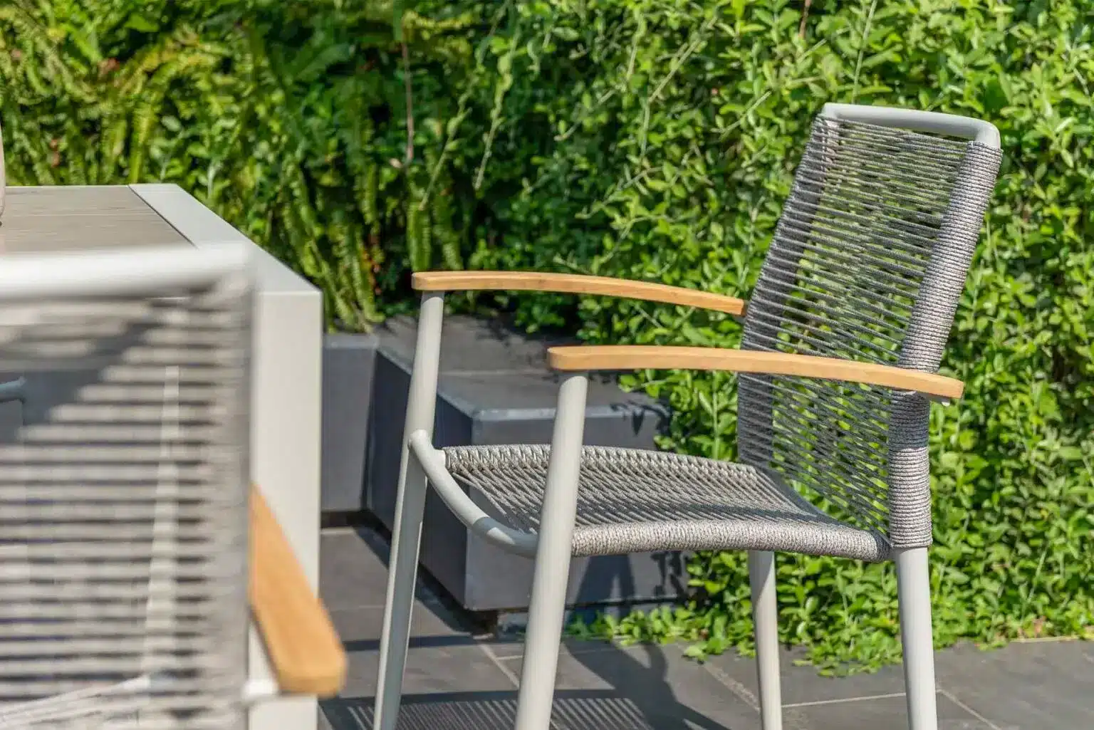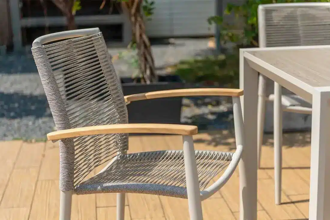 שזירת החבלים מעניקה לכיסא מראה ייחודי ומעודכן, והגב המשופע מעוצב לנוחות אופטימלית גם בישיבה ממושכת.