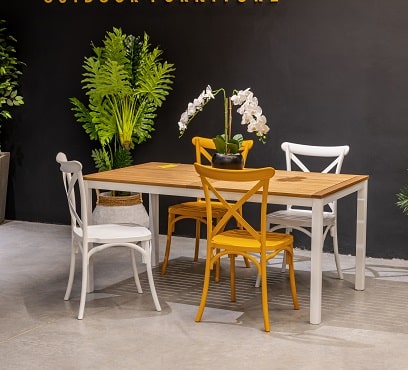 השולחן בנוי משלדת אלומיניום “אל חלד” בשילוב עץ אקליפטוס FSC מלא.