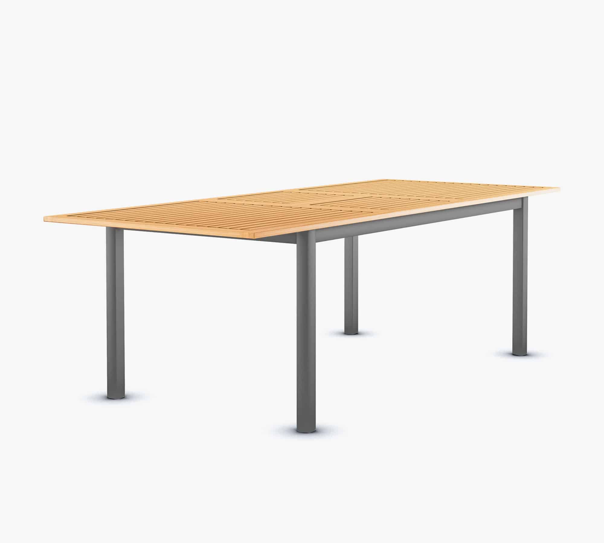 השולחן בנוי משלדת אלומיניום “אל חלד” בשילוב לוחות עץ אקליפטוס FSC.