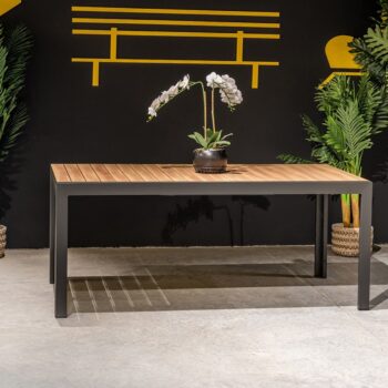 השולחן בנוי משלדת אלומיניום “אל חלד” בשילוב לוחות דמוי עץ.