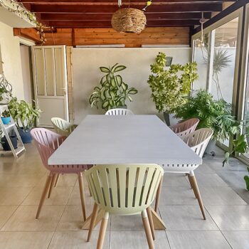 שולחן יוקרתי במיוחד הבנוי מרגלי אלומיניום “דמוי עץ” בשילוב פלטת בטון מחוזק פיברגלס.