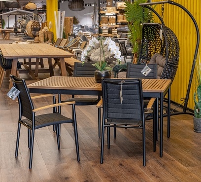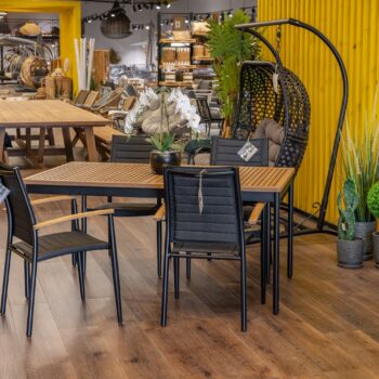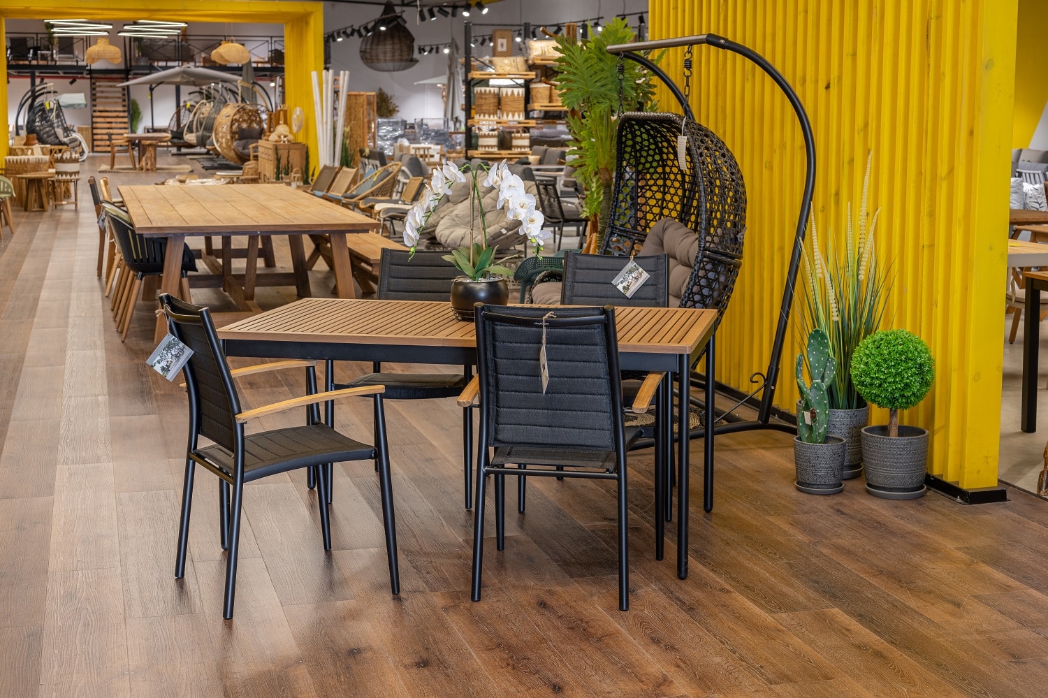 השולחן בנוי משלדת אלומיניום “אל חלד” בשילוב לוחות עץ אקליפטוס FSC.