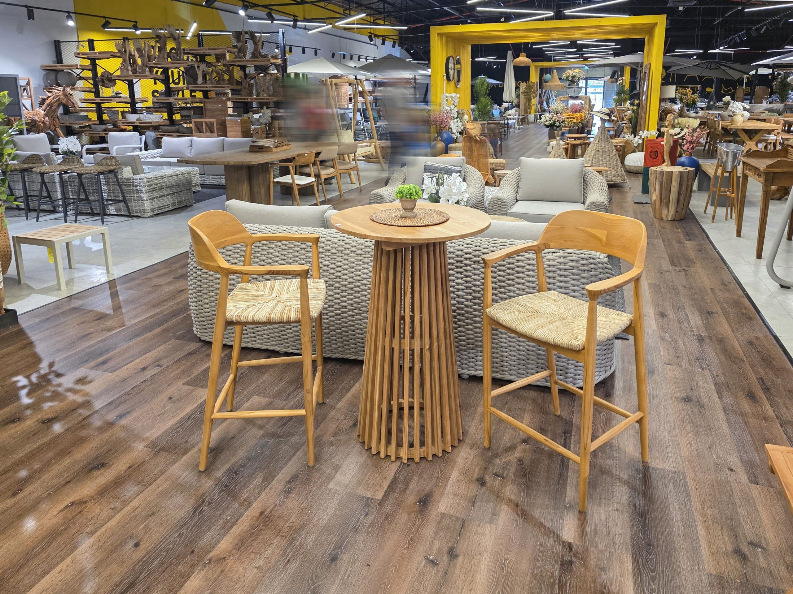 הכיסאות בנויים מעץ טיק אינדונזי בשילוב מושב קני קש קלוע.