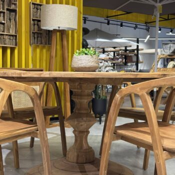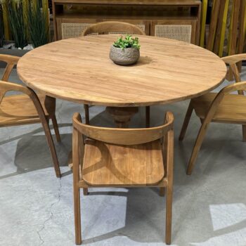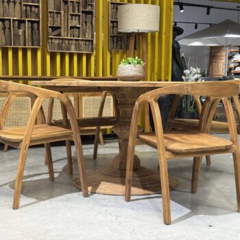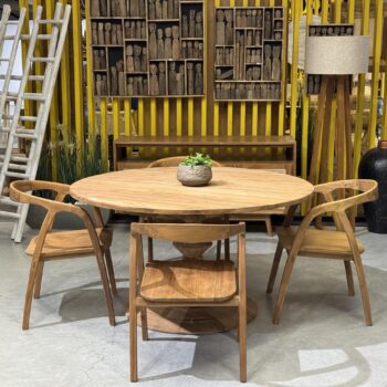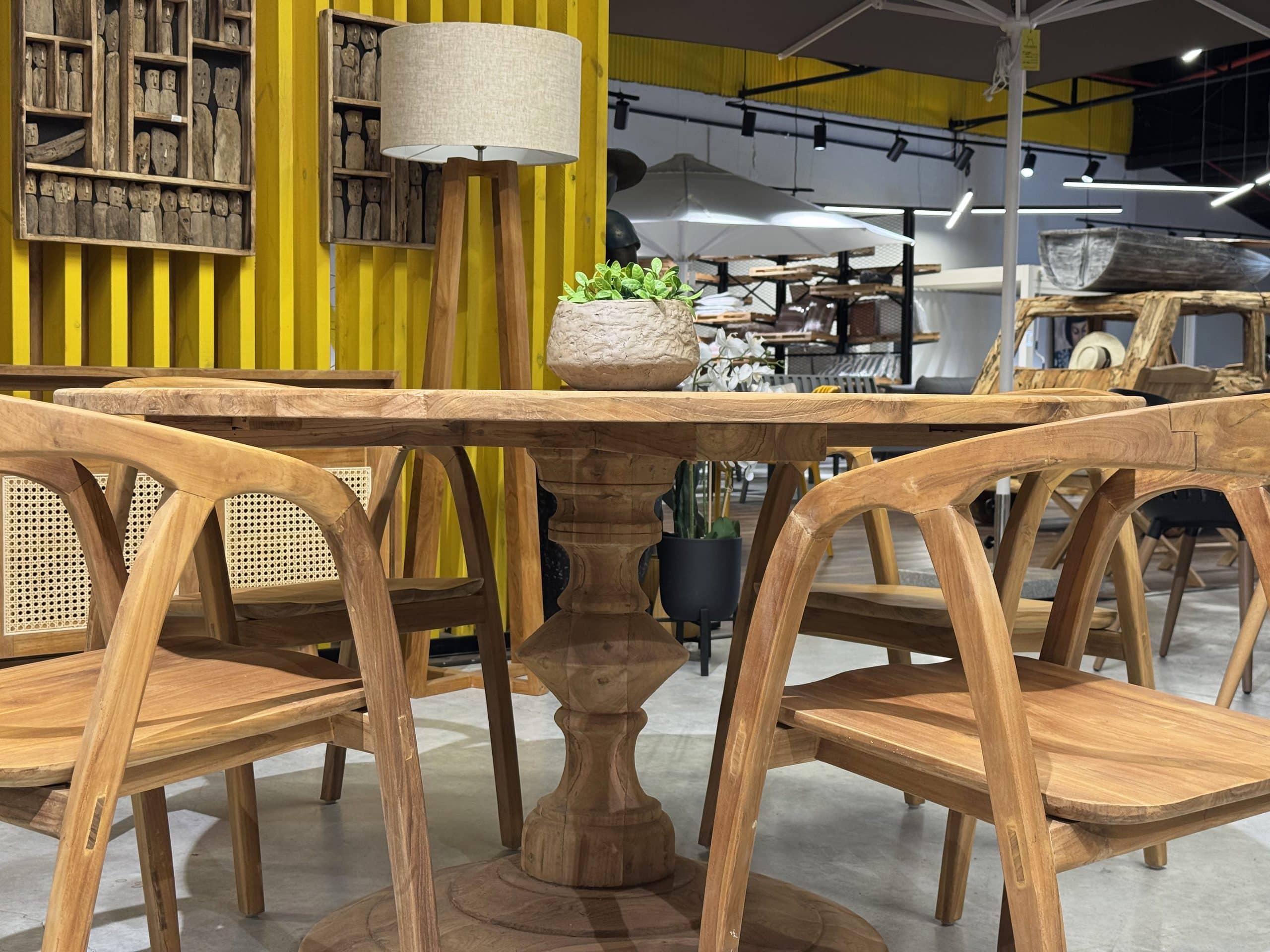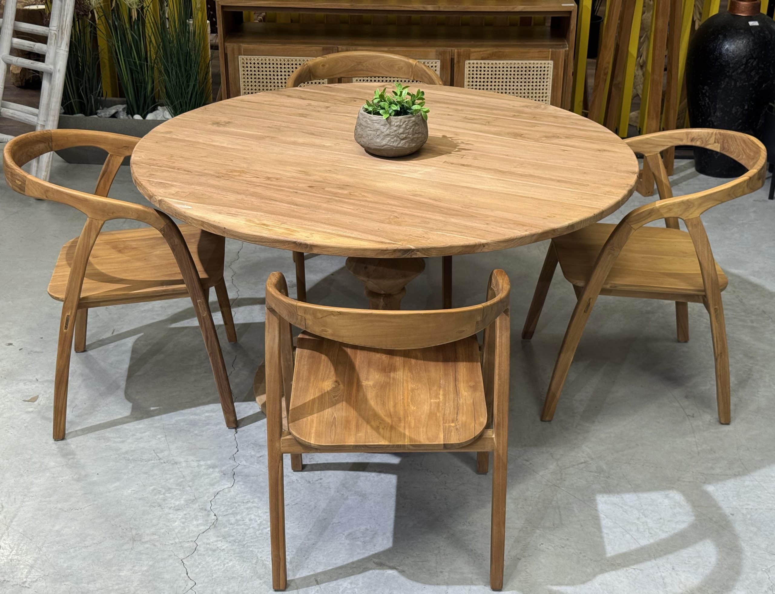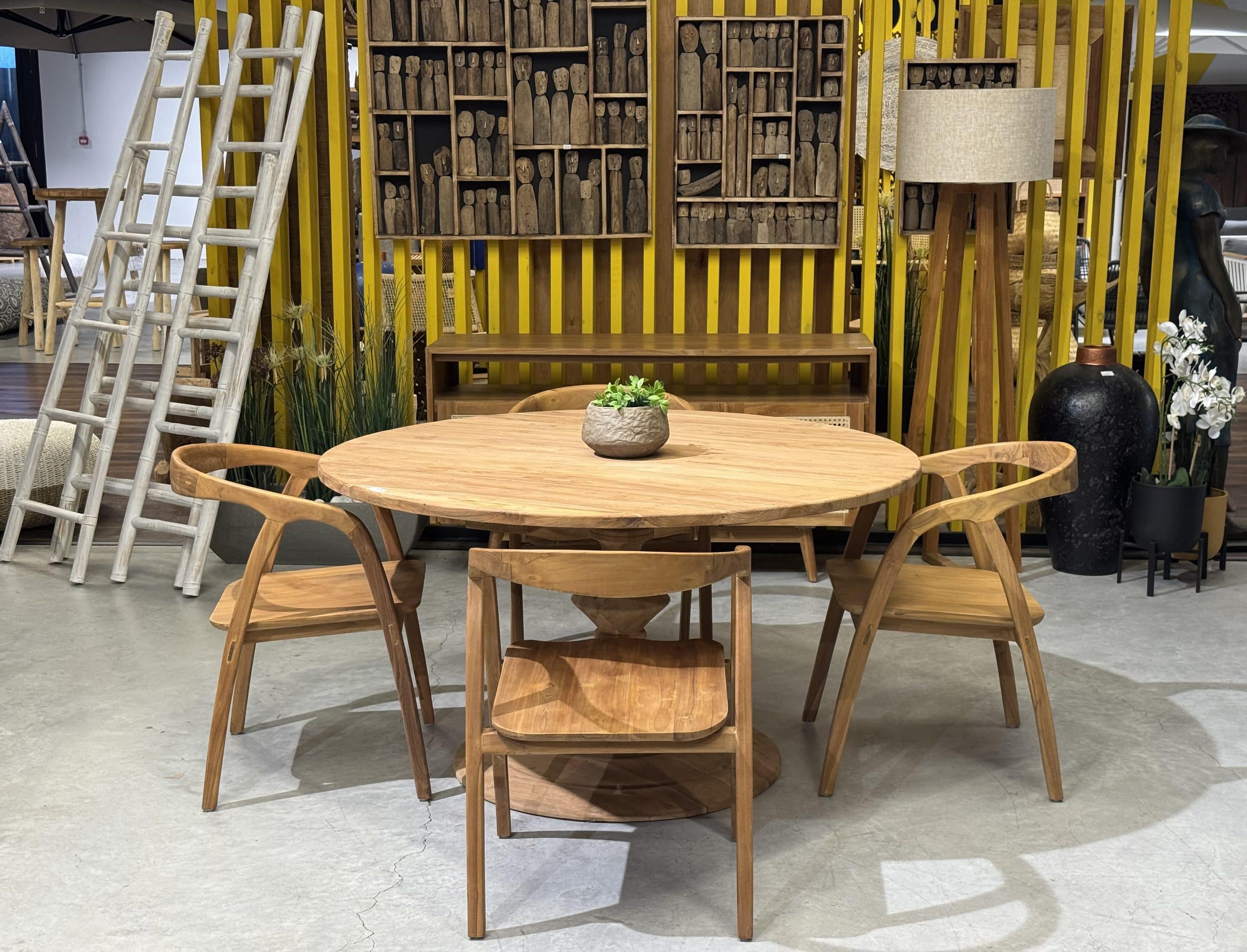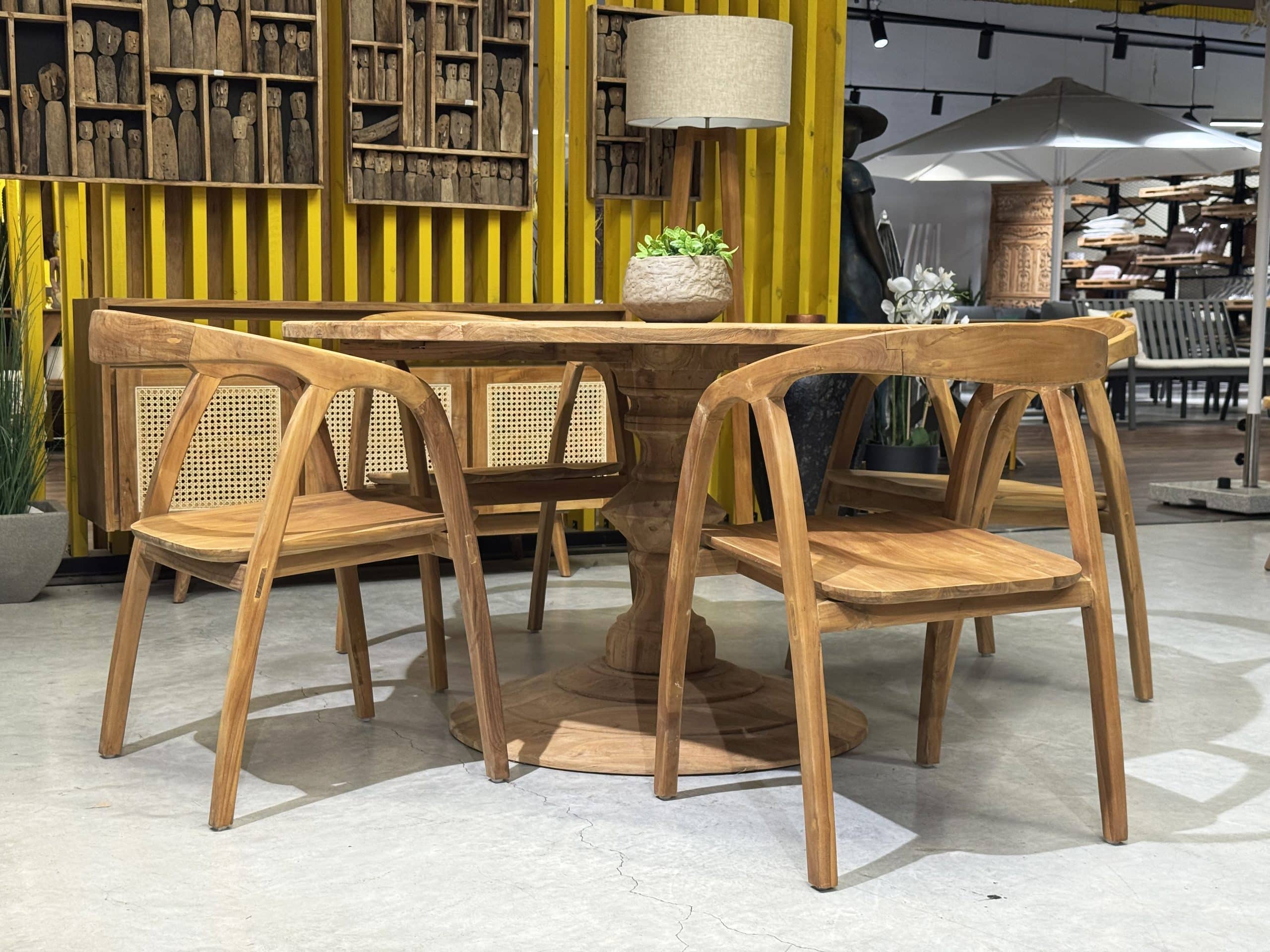 השולחן והכיסאות בנויים מעץ טיק אינדונזי מלא.