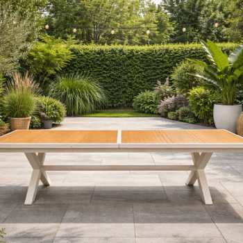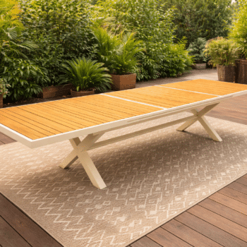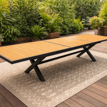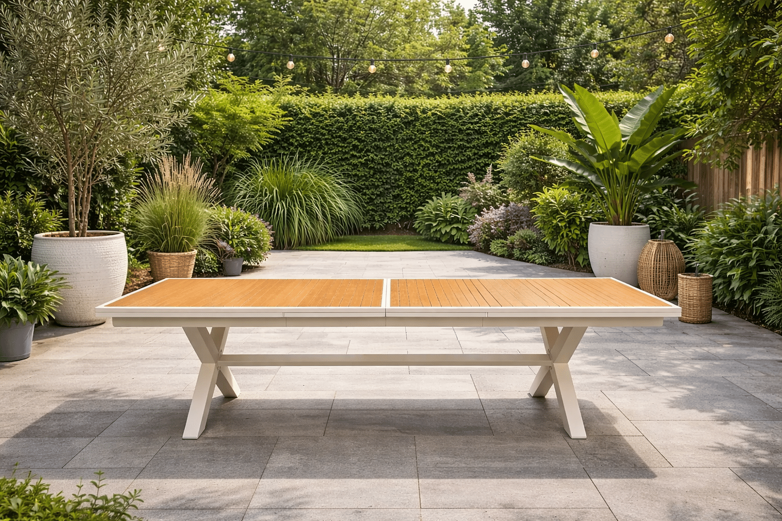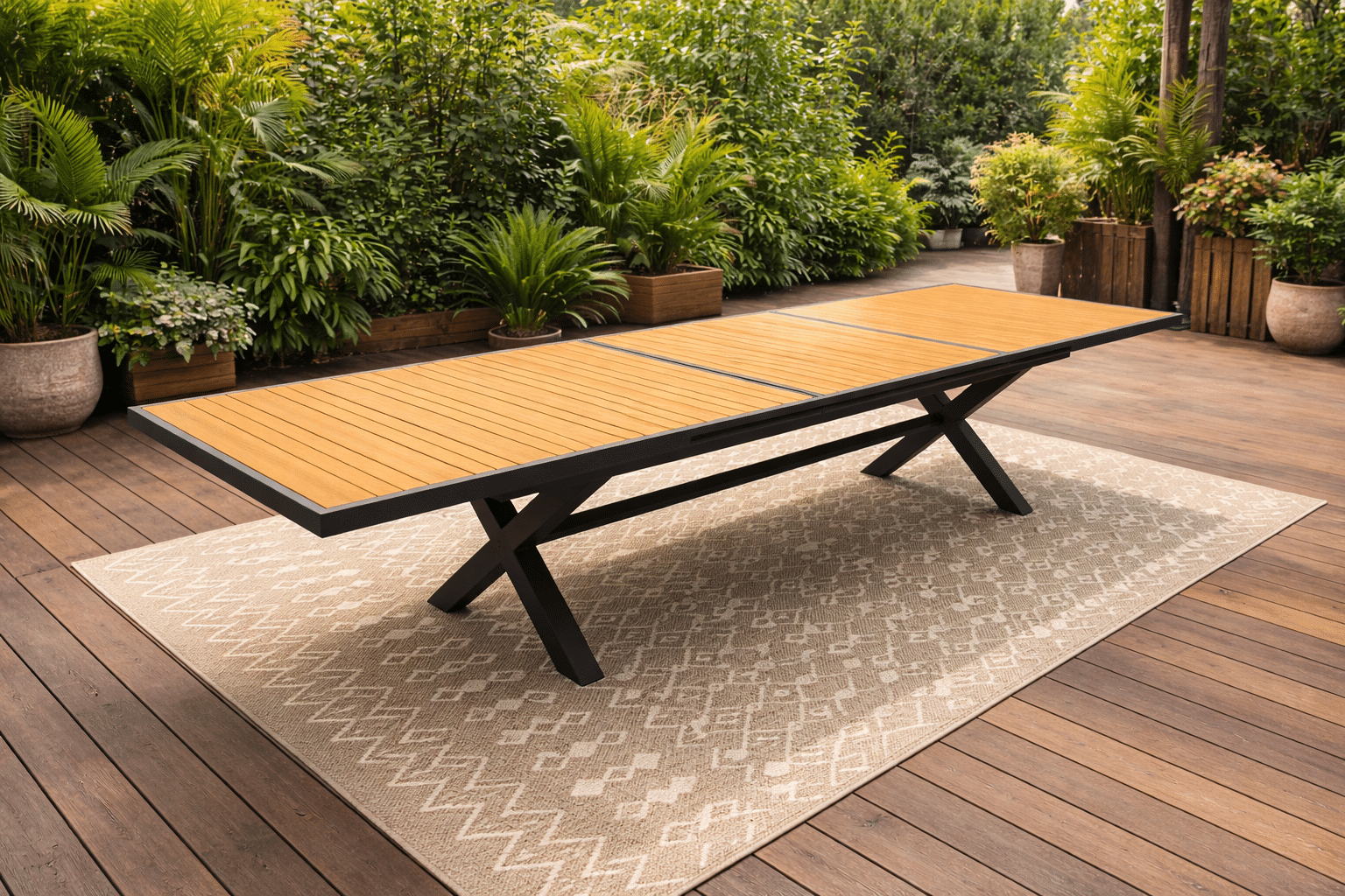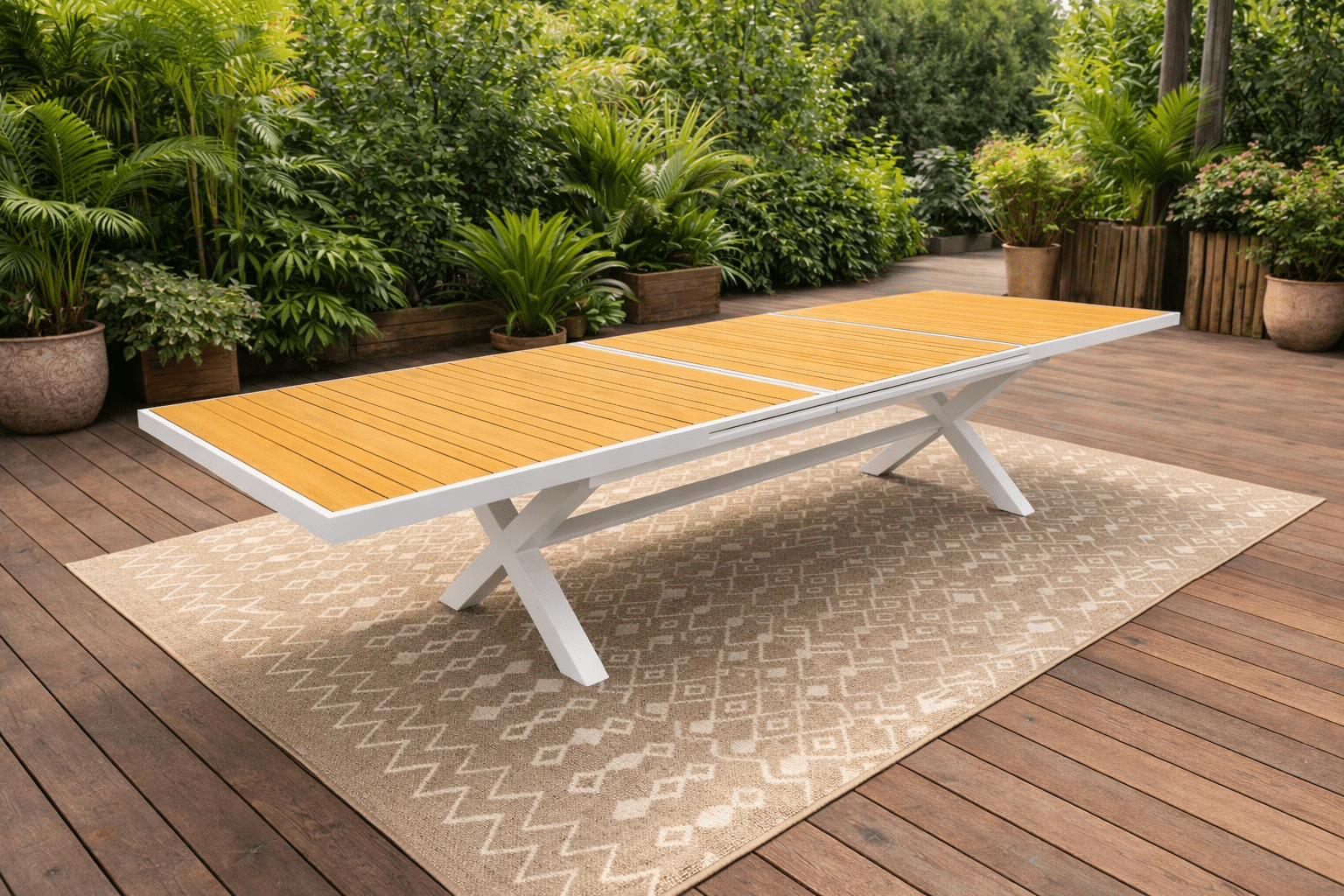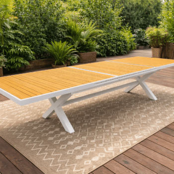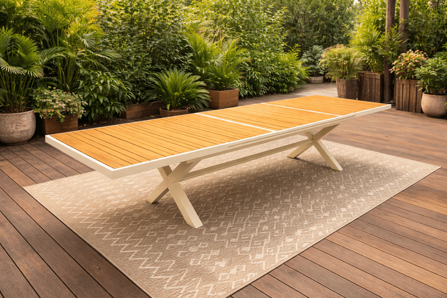 שולחן נפתח העשוי אלומיניום “אל חלד” במידה 295*100 ס”מ, נפתח ל-400 ס”מ.