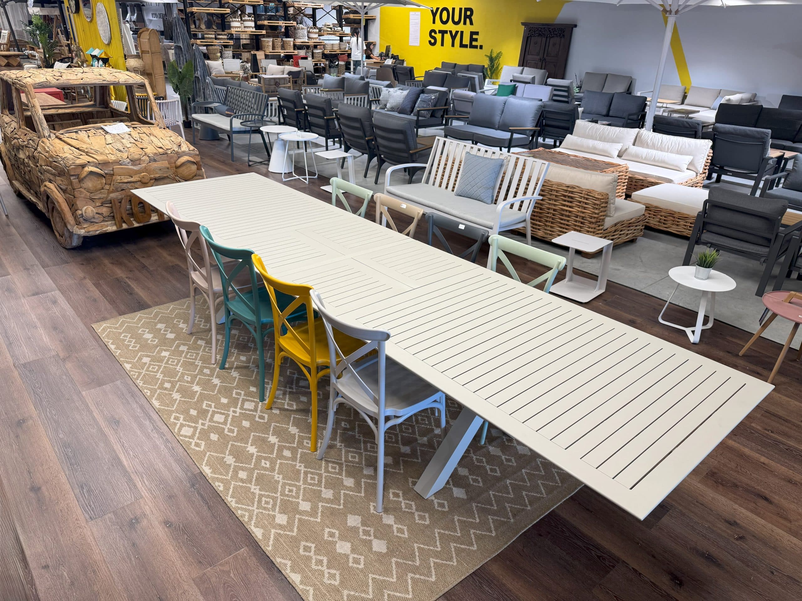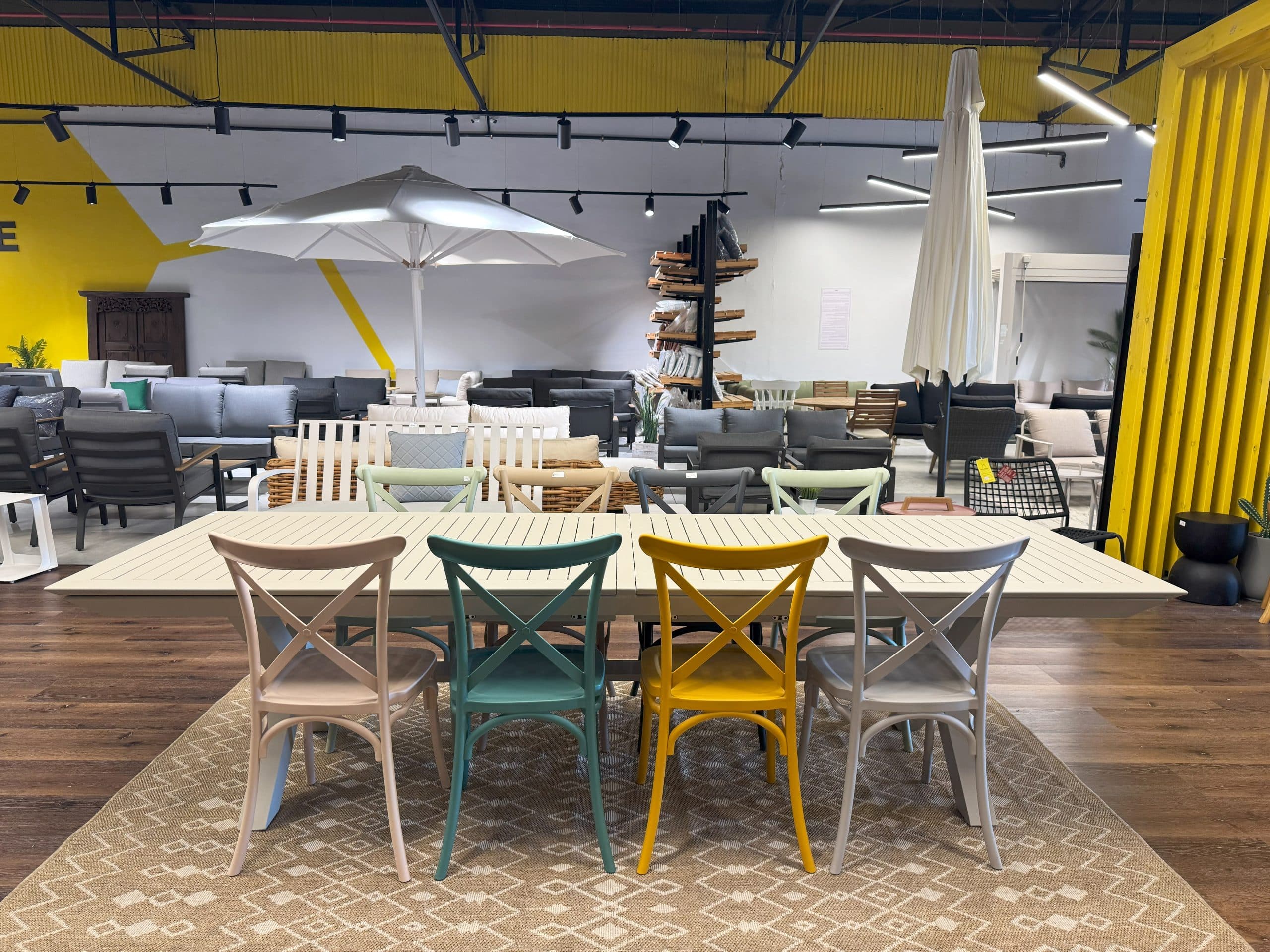 שולחן אלומיניום דגם דלהי 400 + 8 כיסאות מדגם הריטאז’ במבחר צבעים לבחירה.