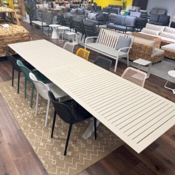 שולחן נפתח העשוי אלומיניום “אל חלד” במידה 295*100 ס”מ, נפתח ל-400 ס”מ.
