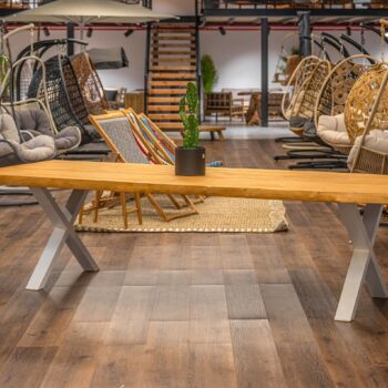 שולחן עץ טיק אינדונזי מלא, עץ צפוף, כבד, גימור טבעי ומקומר.