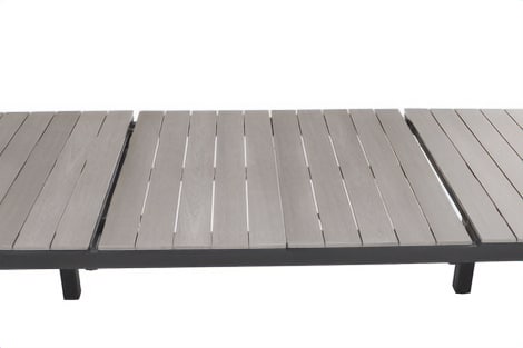 השולחן בנוי משלדת אלומיניום “אל חלד” בשילוב לוחות דמוי עץ.