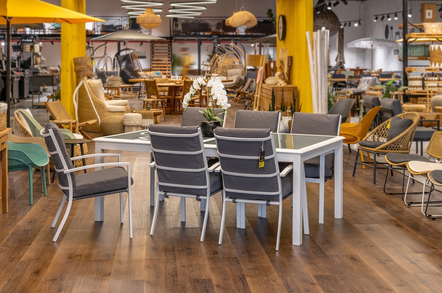 צבעי הכיסאות: מסגרת לבנה, בד אפור כהה.