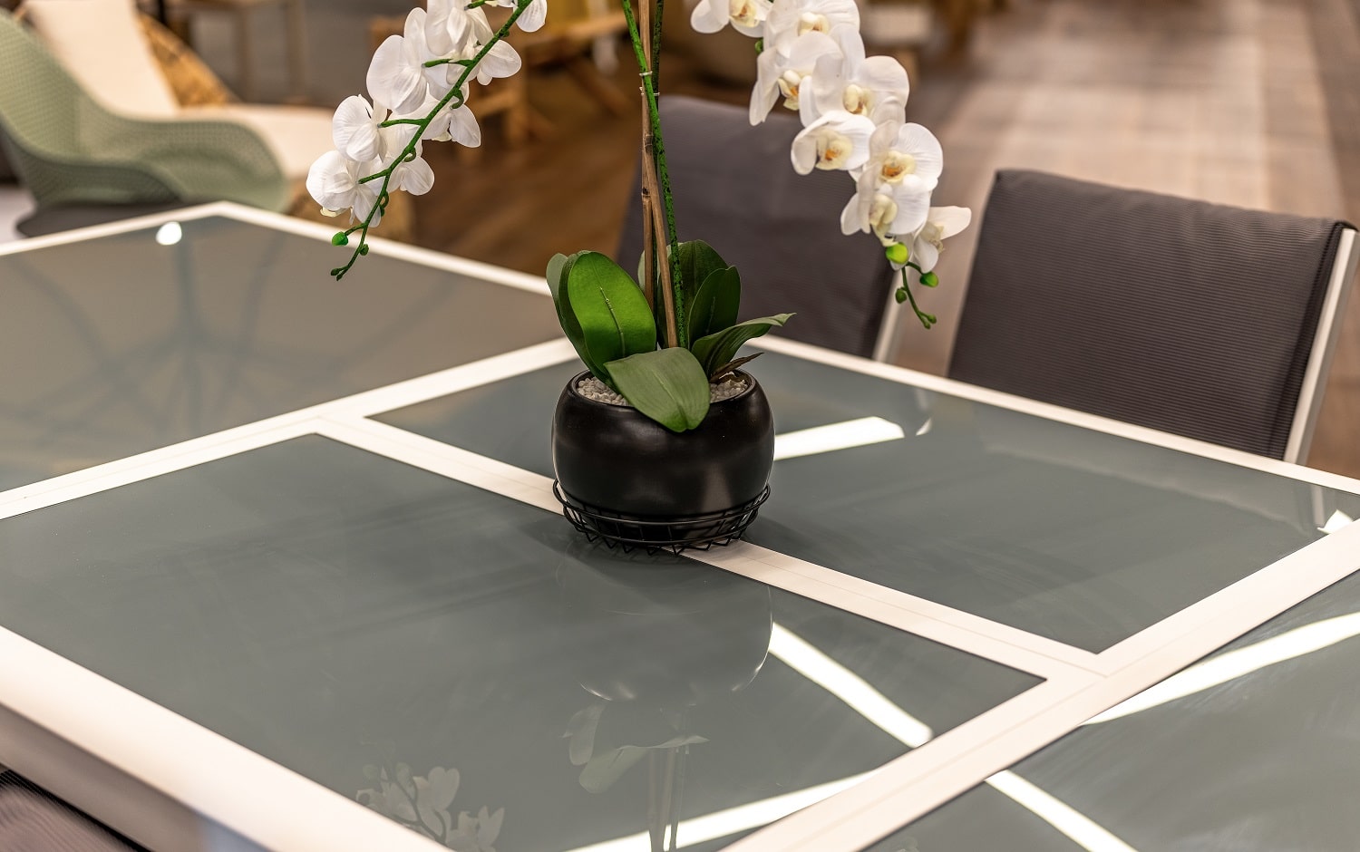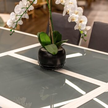 צבע השולחן: מסגרת לבנה, זכוכית אפורה בהירה.