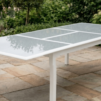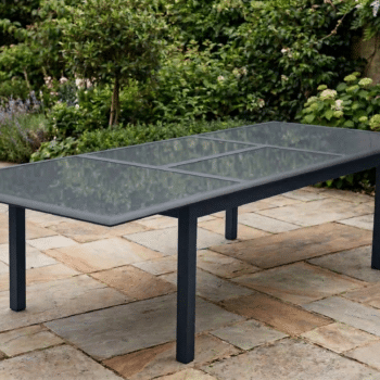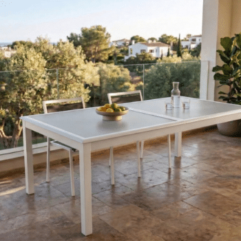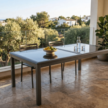 שולחן האוכל בנוי מאלומיניום “אל חלד” מחוזק עם הגנה ותמיכה במסגרת השולחן.