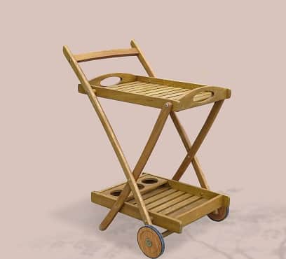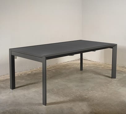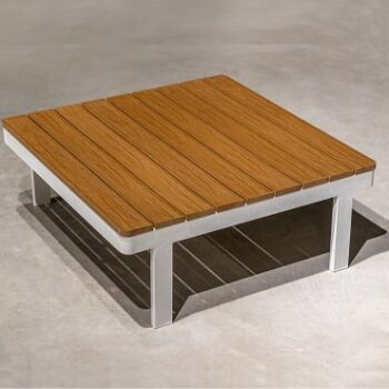 שולחן קפה מעוצב הבנוי משלדת אלומיניום “אל חלד” בחיפוי לוחות PVC דמוי עץ.