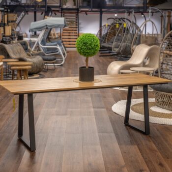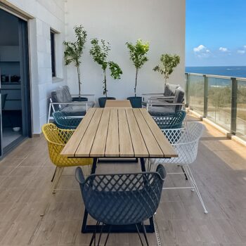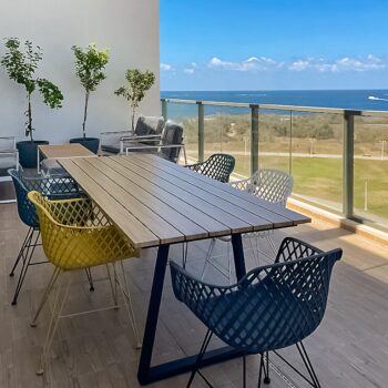 שולחן יוקרתי במיוחד הבנוי מרגלי אלומיניום “אל חלד” בשילוב משטח עליון אלומיניום דמוי עץ.