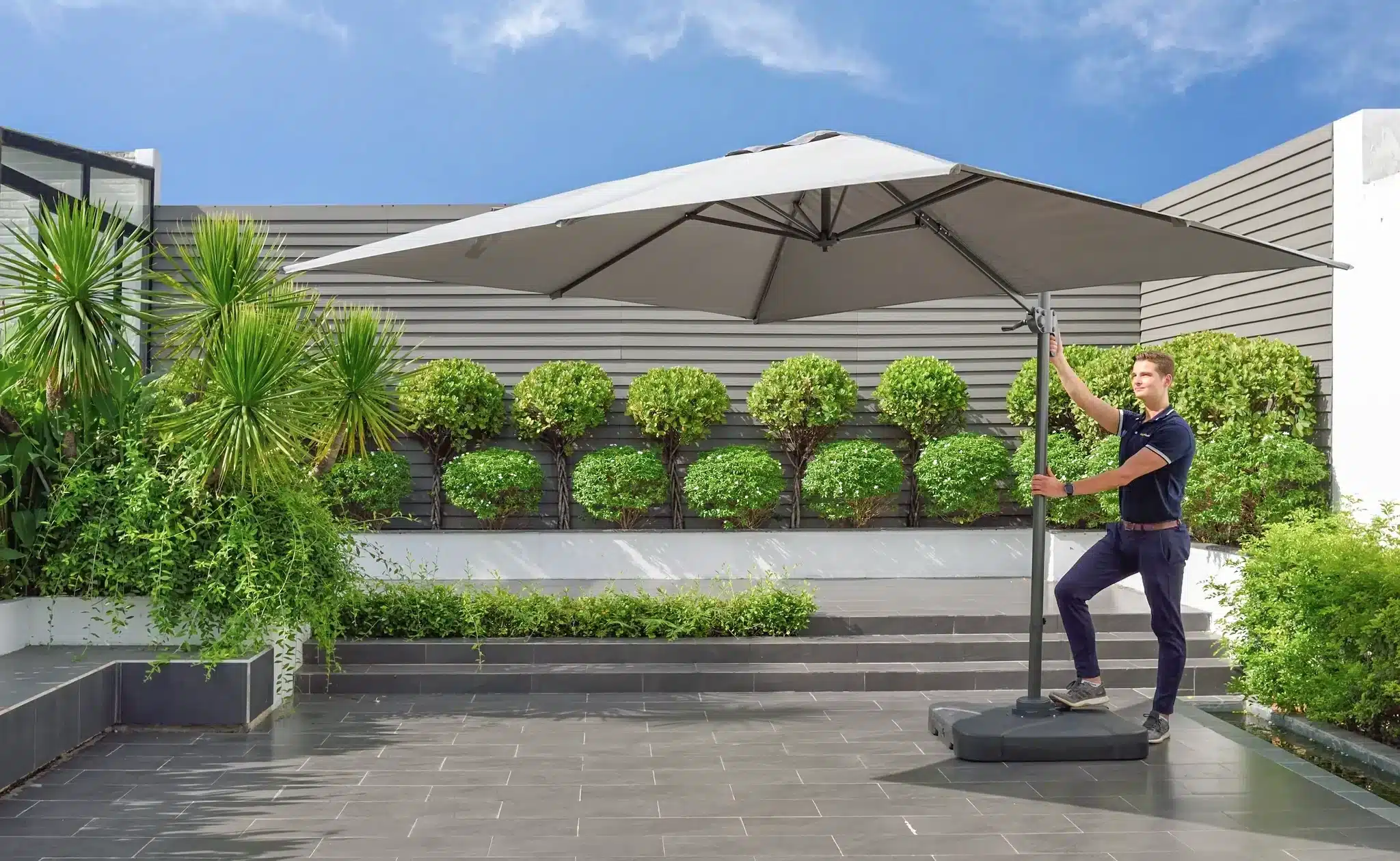 הכירו את השמשייה המושלמת לאירוח חוץ – בעיצוב קנטילבר חכם שמבטל את הצורך בעמוד מרכזי, כך ששום דבר לא יעמוד ביניכם לבין השיחה סביב שולחן האוכל.