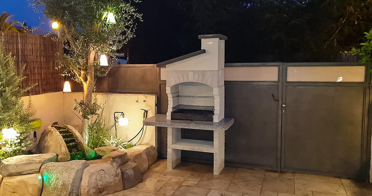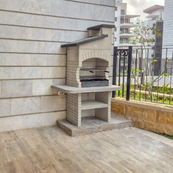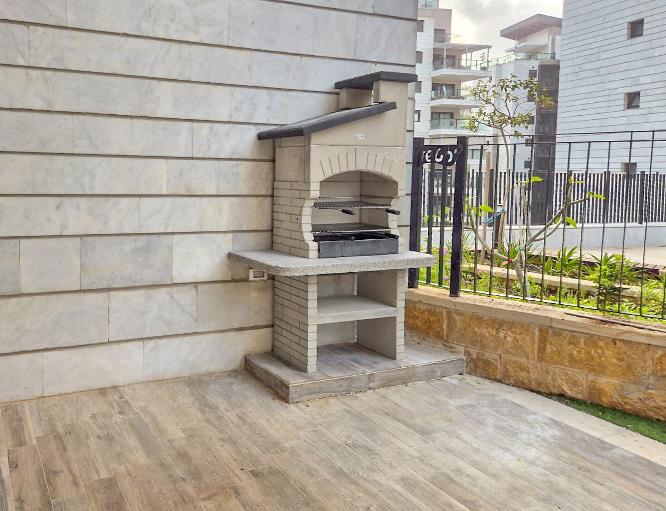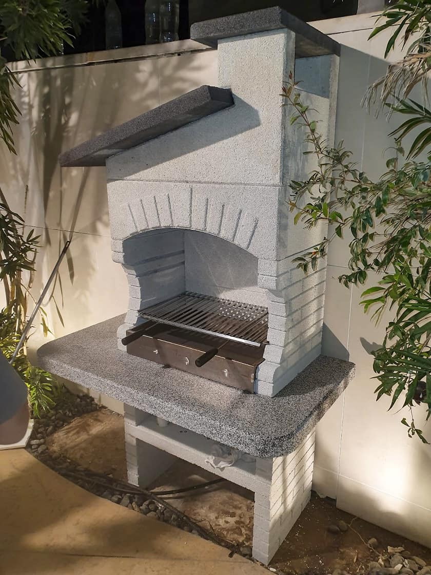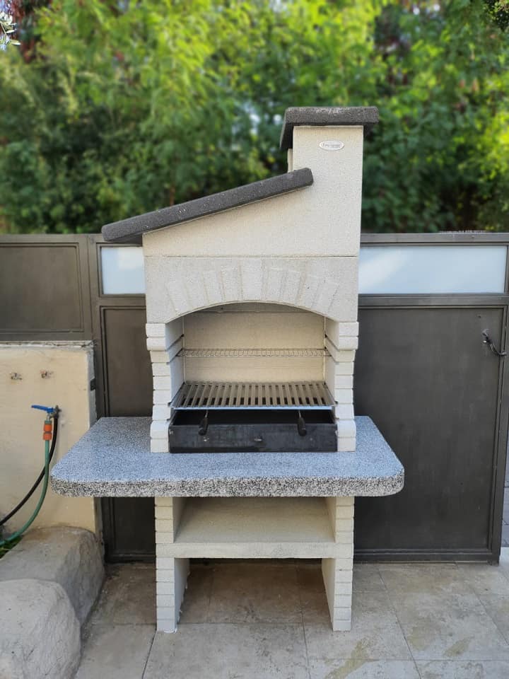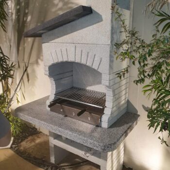 מבנה הגריל עשוי מחומר מיוחד דחוס ועמיד (שיש MARMOTECH), דמוי לבנים בצבע לבן אפרפר.