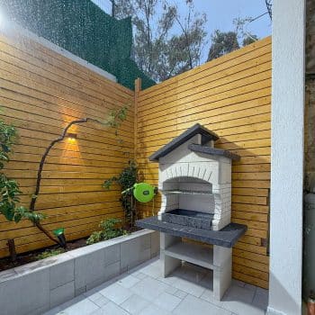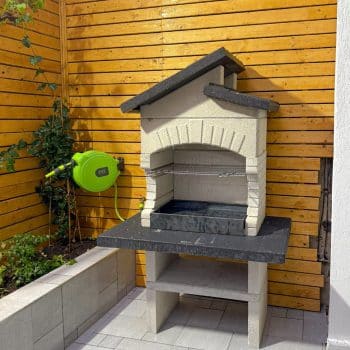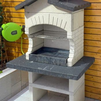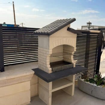 מבנה הגריל עשוי מחומר מיוחד דחוס ועמיד (שיש MARMOTECH), דמוי לבנים בצבע לבן אפרפר, רגלי המבנה בצבע אפור.