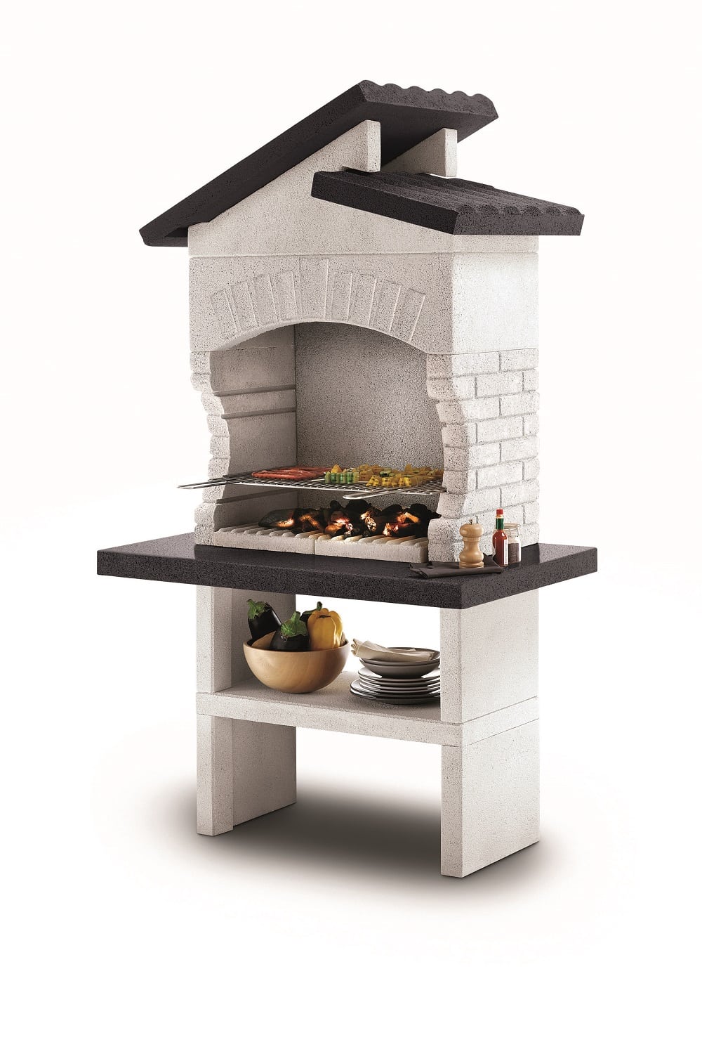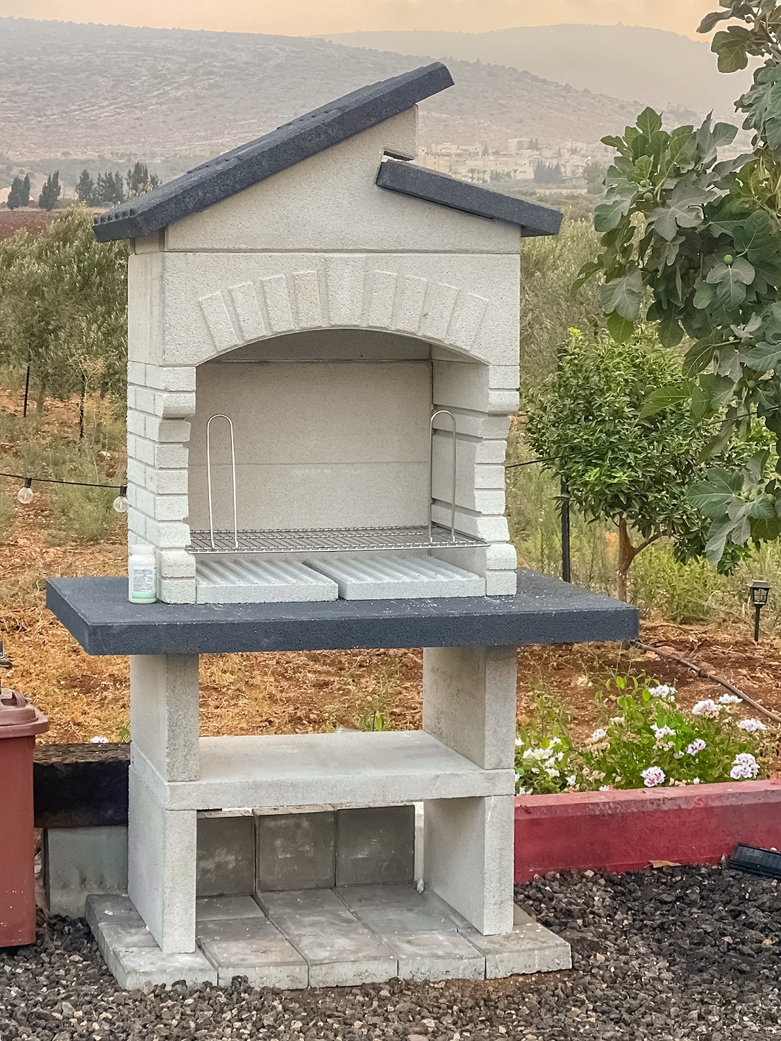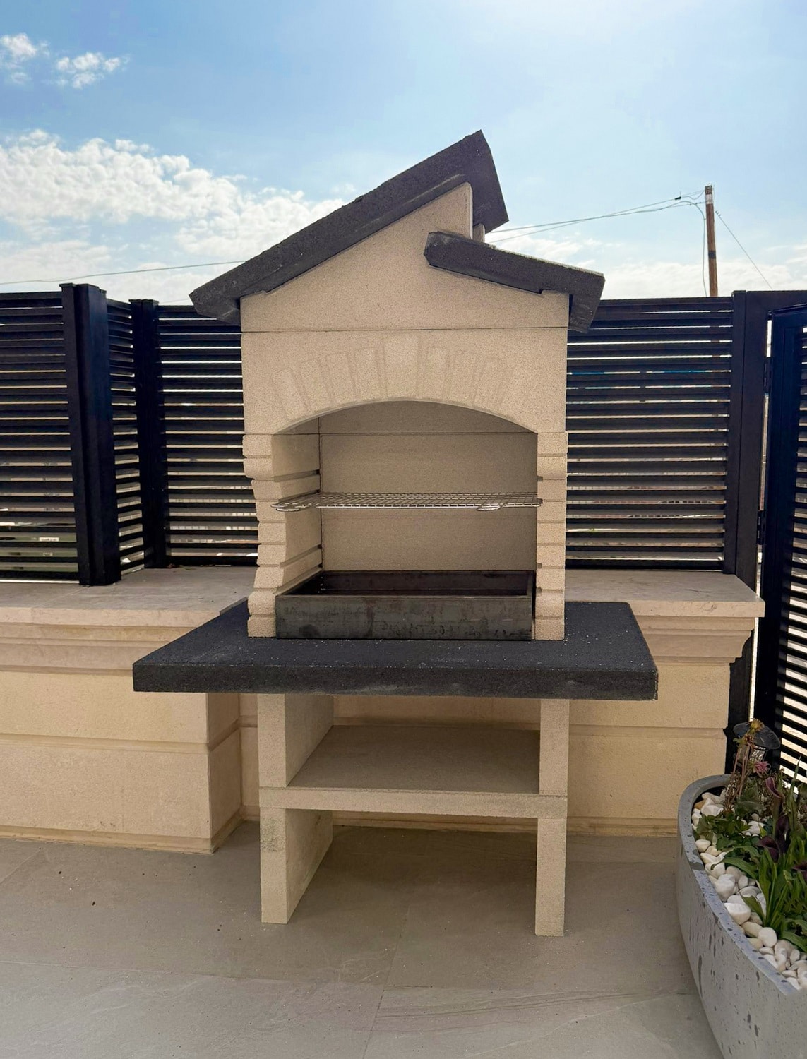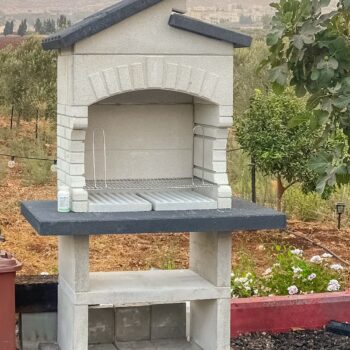 מבנה הגריל עשוי מחומר מיוחד דחוס ועמיד (שיש MARMOTECH), דמוי לבנים בצבע לבן אפרפר, רגלי המבנה בצבע אפור.