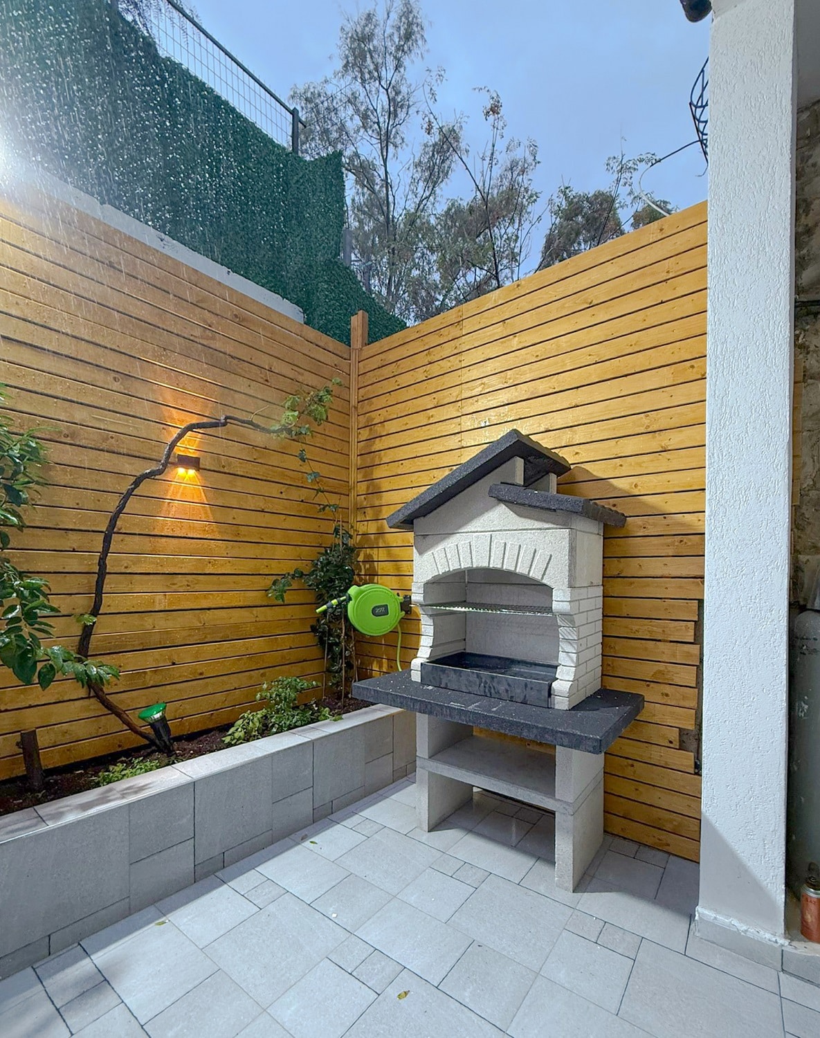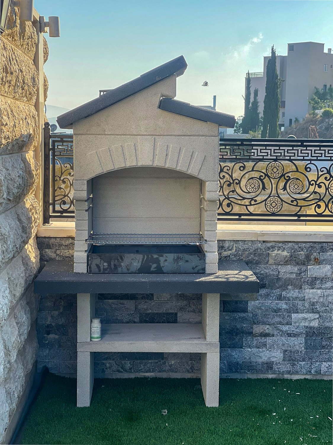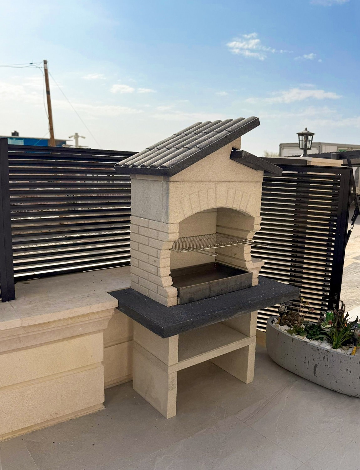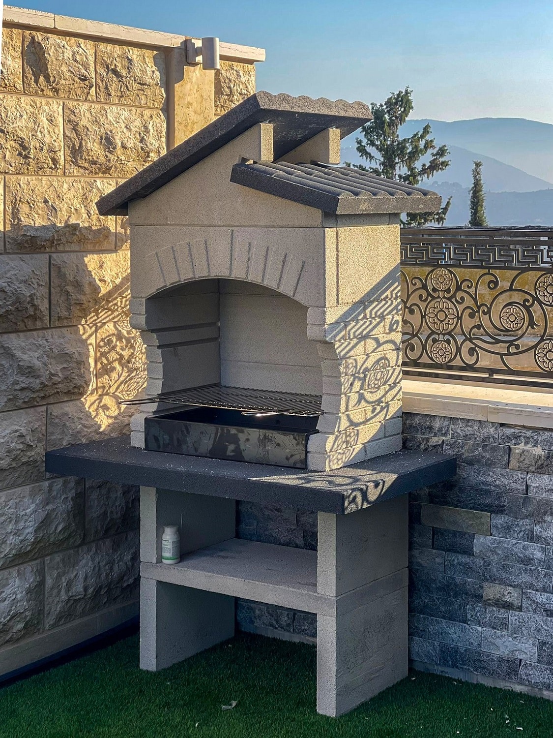 מבנה הגריל עשוי מחומר מיוחד דחוס ועמיד (שיש MARMOTECH), דמוי לבנים בצבע לבן אפרפר, רגלי המבנה בצבע אפור.