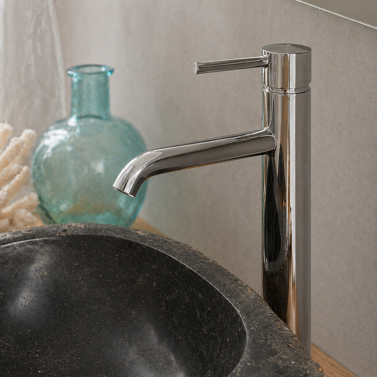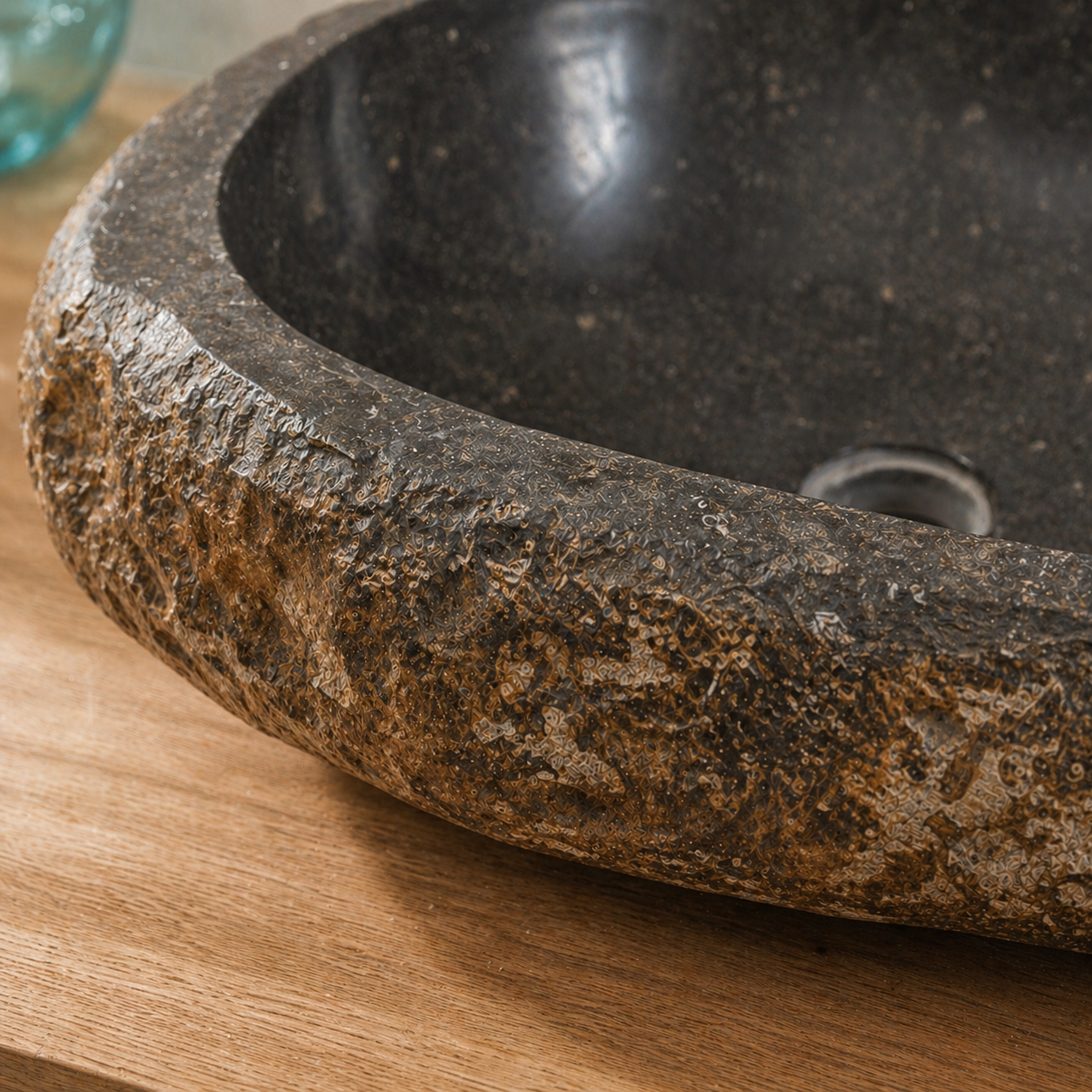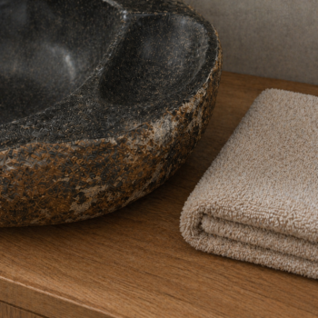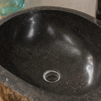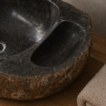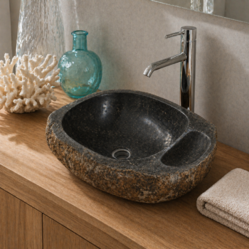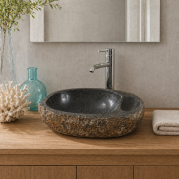 כיור מונח יוקרתי עשוי חלוקי נחל טבעיים בגוון אפור, בעיצוב אורגני ומרשים שמכניס לחדר הרחצה תחושה של ספא טבעי, חם ואלגנטי. לכל כיור טקסטורה ייחודית משלו, עם שילוב טבעי של גוונים, עורקים וסימני אבן ההופכים כל יחידה לפריט ייחודי בעל אופי ונוכחות.