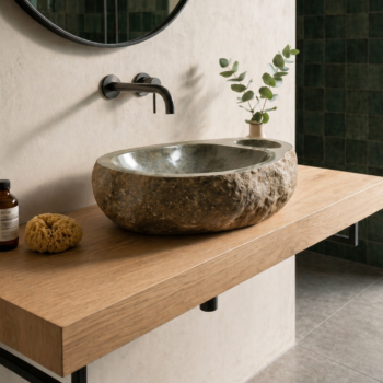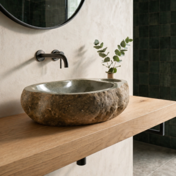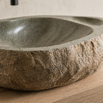 הכיור עשוי חלוק נחל טבעי בגוון אפור, עם קווים אורגניים, מבנה נמוך ורחב וטקסטורה חיצונית טבעית שמדגישה את האופי הגולמי של האבן. החלק הפנימי מלוטש ונעים למגע, לזרימת מים חלקה ולניקוי נוח, בעוד החלק החיצוני שומר על המראה המחוספס והאותנטי של האבן.