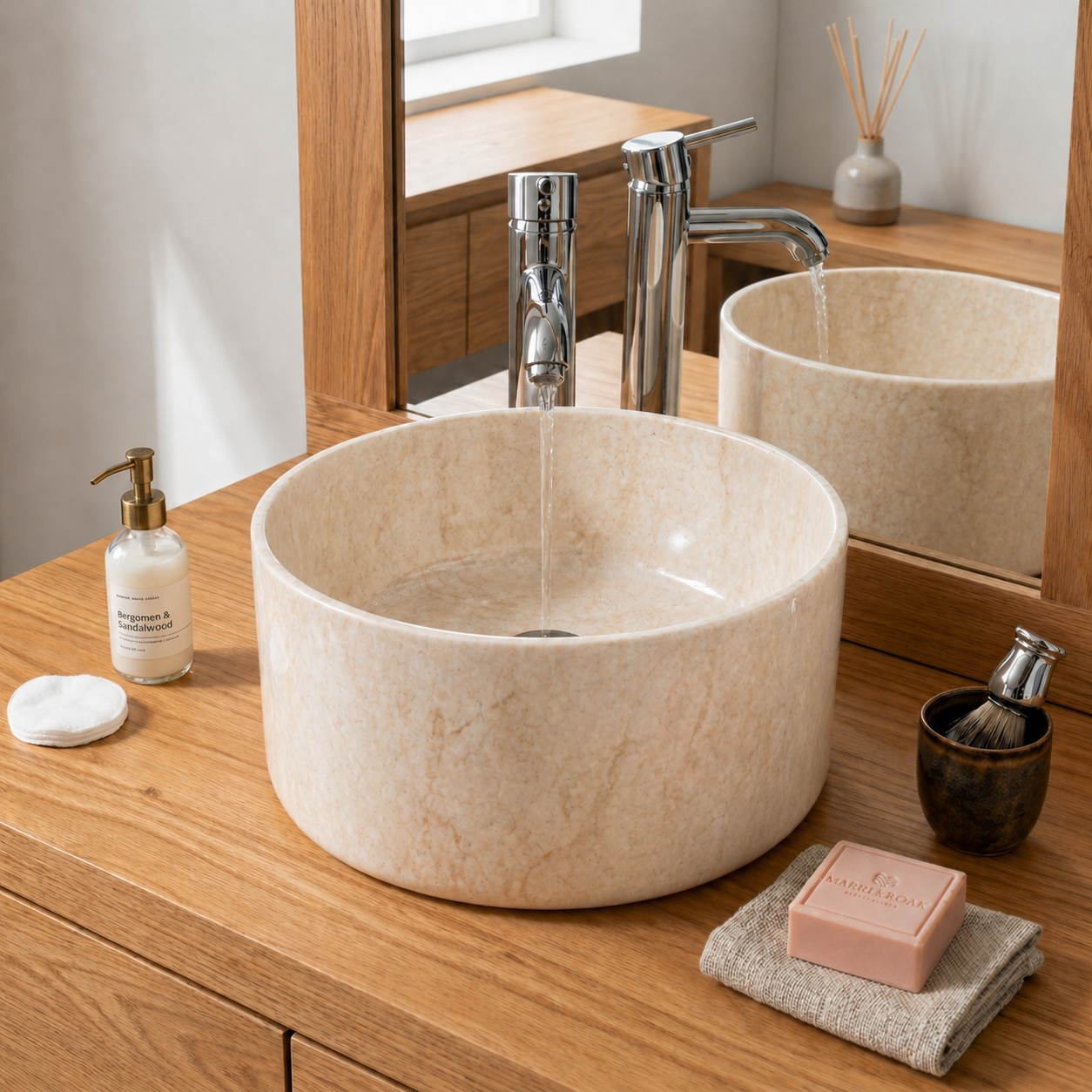 כיור מונח יוקרתי בעיצוב עגול ונקי, המעניק לחדר הרחצה מראה מודרני, אלגנטי ומוקפד. גוון השיש משתלב בצורה טבעית עם משטחי עץ, אבן, בטון או ארונות רחצה בגימור בהיר וכהה, ויוצר תחושה של חלל רחצה יוקרתי בסגנון קטלוג אדריכלי.