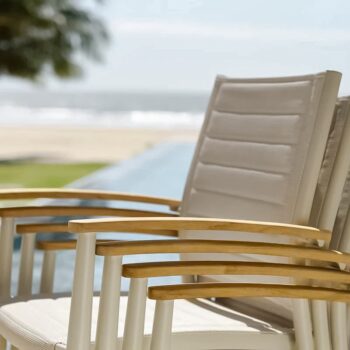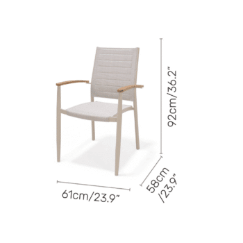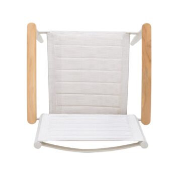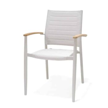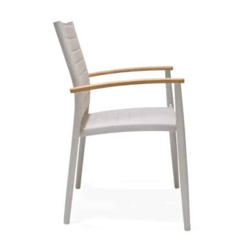 כיסא מעוצב ויוקרתי אשר בנוי משלדת אלומיניום “אל חלד” בשילוב משענות ידיים מעץ טיק אינדונזי.